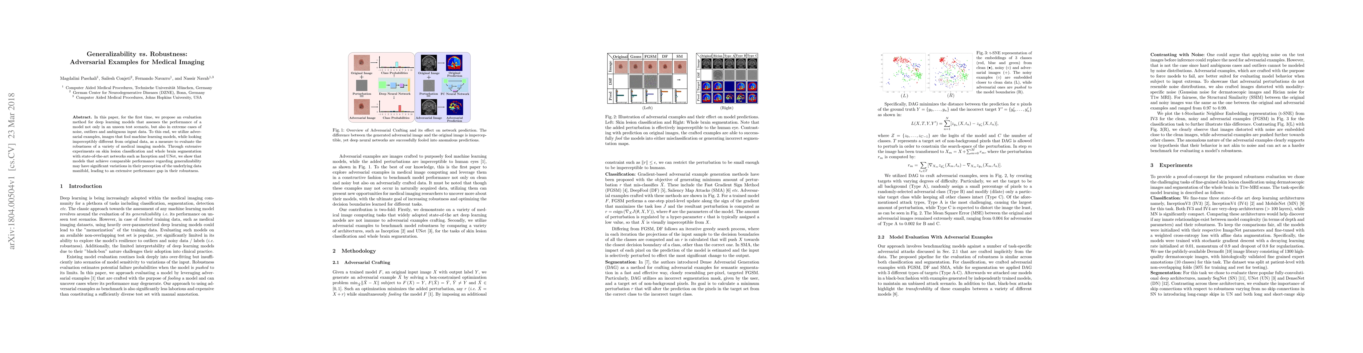 In this paper, for the first time, we propose an evaluation method for deep learning models that assesses the performance of a model not only in an unseen test scenario, but also in extreme cases of noise, outliers and ambiguous input data. To this end, we utilize adversarial examples, images that fool machine learning models, while looking imperceptibly different from original data, as a measure to evaluate the robustness of a variety of medical imaging models. Through extensive experiments on skin lesion classification and whole brain segmentation with state-of-the-art networks such as Inception and UNet, we show that models that achieve comparable performance regarding generalizability may have significant variations in their perception of the underlying data manifold, leading to an extensive performance gap in their robustness.