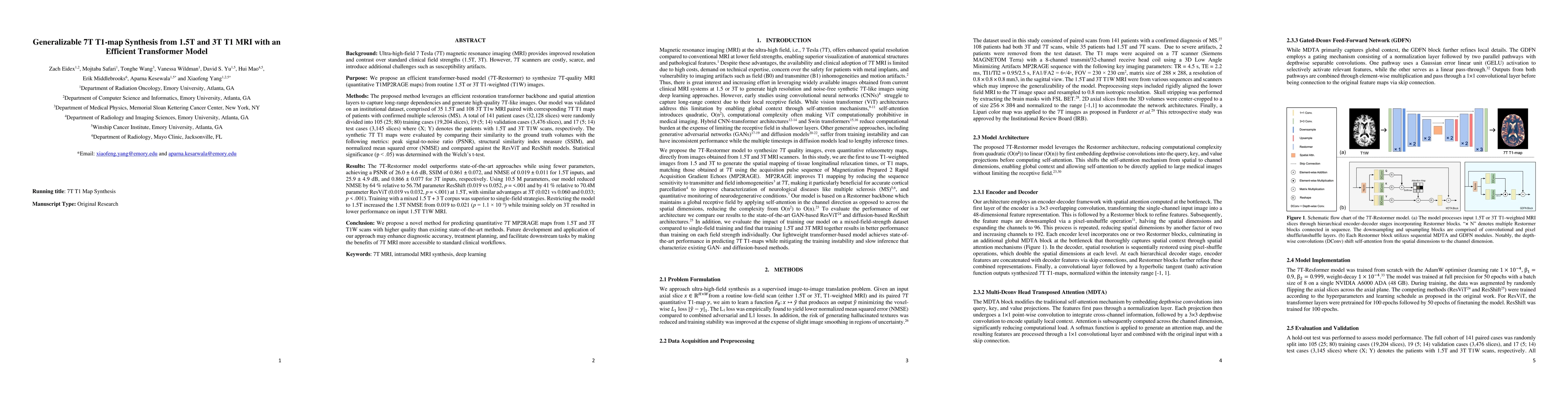 Purpose: Ultra-high-field 7T MRI offers improved resolution and contrast over standard clinical field strengths (1.5T, 3T). However, 7T scanners are costly, scarce, and introduce additional challenges such as susceptibility artifacts. We propose an efficient transformer-based model (7T-Restormer) to synthesize 7T-quality T1-maps from routine 1.5T or 3T T1-weighted (T1W) images. Methods: Our model was validated on 35 1.5T and 108 3T T1w MRI paired with corresponding 7T T1 maps of patients with confirmed MS. A total of 141 patient cases (32,128 slices) were randomly divided into 105 (25; 80) training cases (19,204 slices), 19 (5; 14) validation cases (3,476 slices), and 17 (5; 14) test cases (3,145 slices) where (X; Y) denotes the patients with 1.5T and 3T T1W scans, respectively. The synthetic 7T T1 maps were compared against the ResViT and ResShift models. Results: The 7T-Restormer model achieved a PSNR of 26.0 +/- 4.6 dB, SSIM of 0.861 +/- 0.072, and NMSE of 0.019 +/- 0.011 for 1.5T inputs, and 25.9 +/- 4.9 dB, and 0.866 +/- 0.077 for 3T inputs, respectively. Using 10.5 M parameters, our model reduced NMSE by 64 % relative to 56.7M parameter ResShift (0.019 vs 0.052, p = <.001 and by 41 % relative to 70.4M parameter ResViT (0.019 vs 0.032, p = <.001) at 1.5T, with similar advantages at 3T (0.021 vs 0.060 and 0.033; p < .001). Training with a mixed 1.5 T + 3 T corpus was superior to single-field strategies. Restricting the model to 1.5T increased the 1.5T NMSE from 0.019 to 0.021 (p = 1.1E-3) while training solely on 3T resulted in lower performance on input 1.5T T1W MRI. Conclusion: We propose a novel method for predicting quantitative 7T MP2RAGE maps from 1.5T and 3T T1W scans with higher quality than existing state-of-the-art methods. Our approach makes the benefits of 7T MRI more accessible to standard clinical workflows.