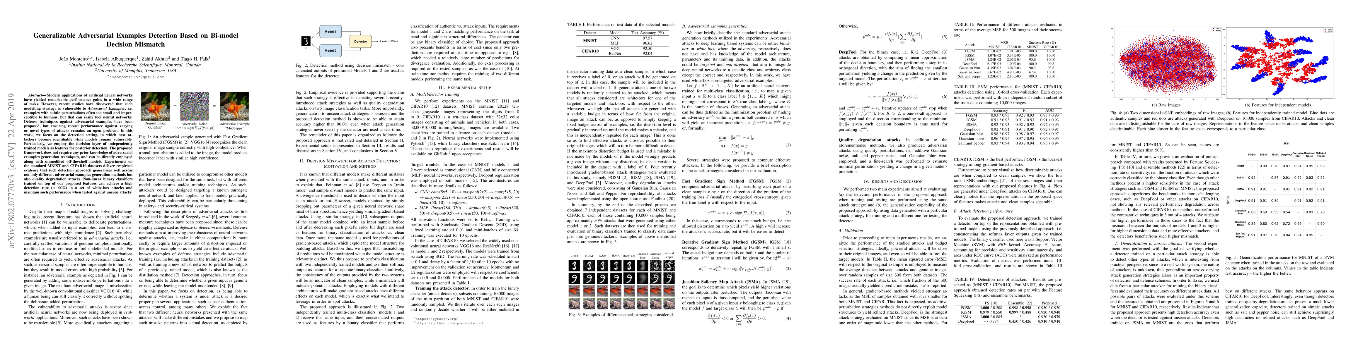 This paper proposes a novel detection framework for adversarial examples using bi-model decision layer mismatch, which leverages independently trained models without requiring prior knowledge of attack techniques. Experiments show that the method generalizes well across various attack types and maintains high detection rates (>90%) even against unseen adversarial examples on MNIST and CIFAR10 datasets.