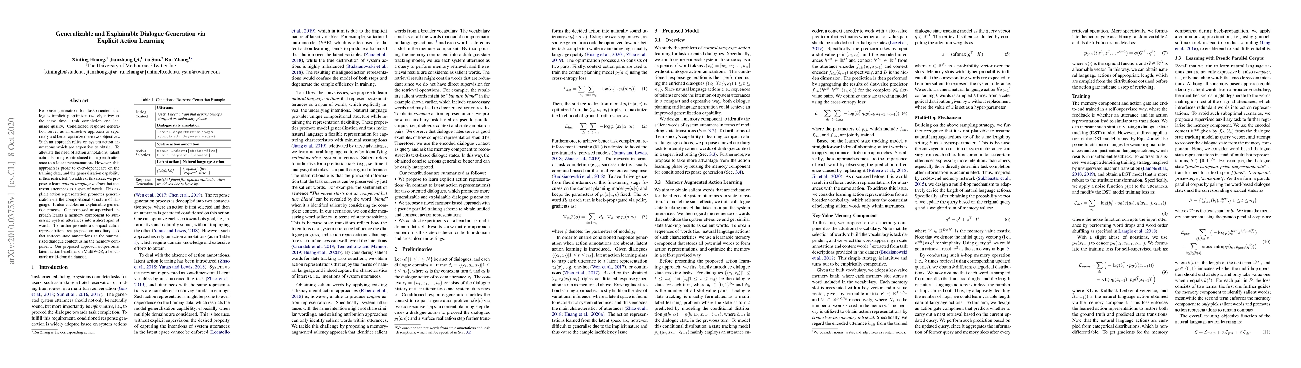 This paper proposes an explicit action learning method for dialogue generation that uses natural language actions to represent utterances, enhancing generalization and explainability. An unsupervised approach with a memory component and an auxiliary task improves the compactness of action representations, outperforming latent action baselines on the MultiWOZ dataset.