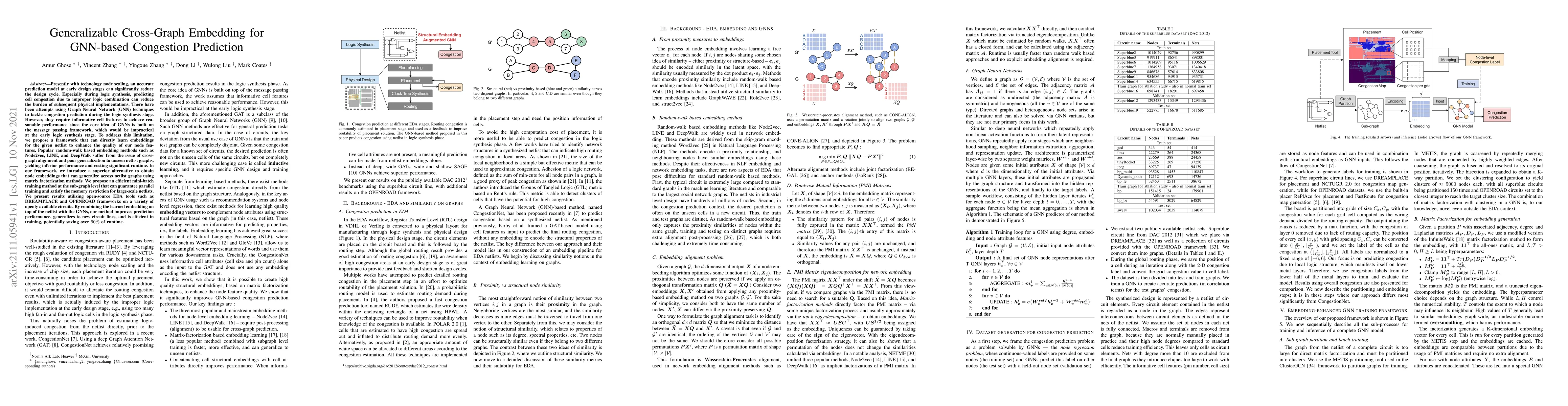 Presently with technology node scaling, an accurate prediction model at early design stages can significantly reduce the design cycle. Especially during logic synthesis, predicting cell congestion due to improper logic combination can reduce the burden of subsequent physical implementations. There have been attempts using Graph Neural Network (GNN) techniques to tackle congestion prediction during the logic synthesis stage. However, they require informative cell features to achieve reasonable performance since the core idea of GNNs is built on the message passing framework, which would be impractical at the early logic synthesis stage. To address this limitation, we propose a framework that can directly learn embeddings for the given netlist to enhance the quality of our node features. Popular random-walk based embedding methods such as Node2vec, LINE, and DeepWalk suffer from the issue of cross-graph alignment and poor generalization to unseen netlist graphs, yielding inferior performance and costing significant runtime. In our framework, we introduce a superior alternative to obtain node embeddings that can generalize across netlist graphs using matrix factorization methods. We propose an efficient mini-batch training method at the sub-graph level that can guarantee parallel training and satisfy the memory restriction for large-scale netlists. We present results utilizing open-source EDA tools such as DREAMPLACE and OPENROAD frameworks on a variety of openly available circuits. By combining the learned embedding on top of the netlist with the GNNs, our method improves prediction performance, generalizes to new circuit lines, and is efficient in training, potentially saving over $90 \%$ of runtime.