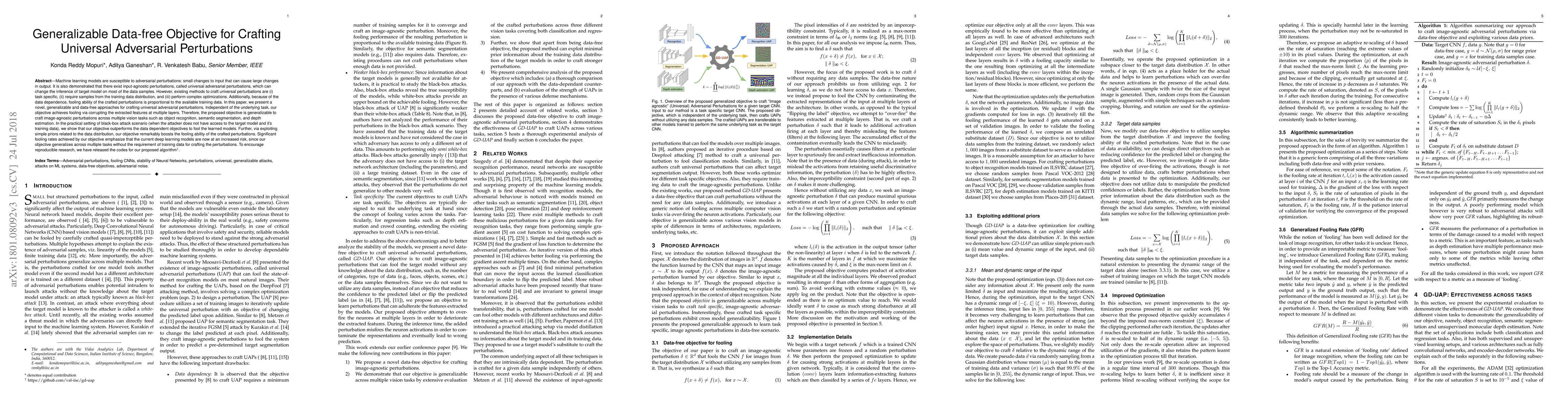 Machine learning models are susceptible to adversarial perturbations: small changes to input that can cause large changes in output. It is also demonstrated that there exist input-agnostic perturbations, called universal adversarial perturbations, which can change the inference of target model on most of the data samples. However, existing methods to craft universal perturbations are (i) task specific, (ii) require samples from the training data distribution, and (iii) perform complex optimizations. Additionally, because of the data dependence, fooling ability of the crafted perturbations is proportional to the available training data. In this paper, we present a novel, generalizable and data-free approaches for crafting universal adversarial perturbations. Independent of the underlying task, our objective achieves fooling via corrupting the extracted features at multiple layers. Therefore, the proposed objective is generalizable to craft image-agnostic perturbations across multiple vision tasks such as object recognition, semantic segmentation, and depth estimation. In the practical setting of black-box attack scenario (when the attacker does not have access to the target model and it's training data), we show that our objective outperforms the data dependent objectives to fool the learned models. Further, via exploiting simple priors related to the data distribution, our objective remarkably boosts the fooling ability of the crafted perturbations. Significant fooling rates achieved by our objective emphasize that the current deep learning models are now at an increased risk, since our objective generalizes across multiple tasks without the requirement of training data for crafting the perturbations. To encourage reproducible research, we have released the codes for our proposed algorithm.