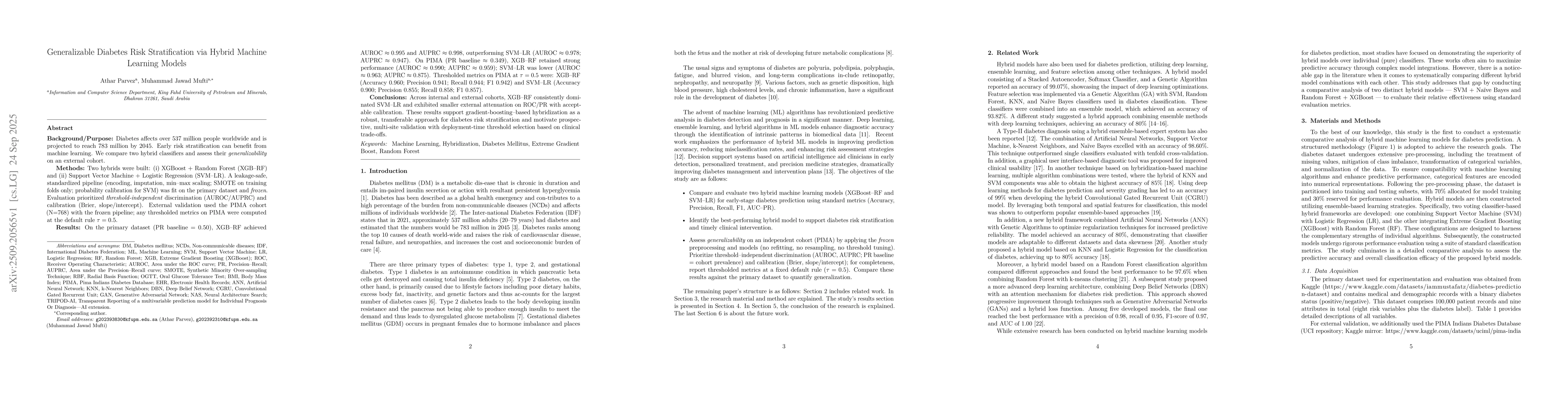 This research provides a robust, transferable approach for diabetes risk stratification using hybrid machine learning models, which could improve early detection and management of diabetes through reliable risk prediction across diverse populations.