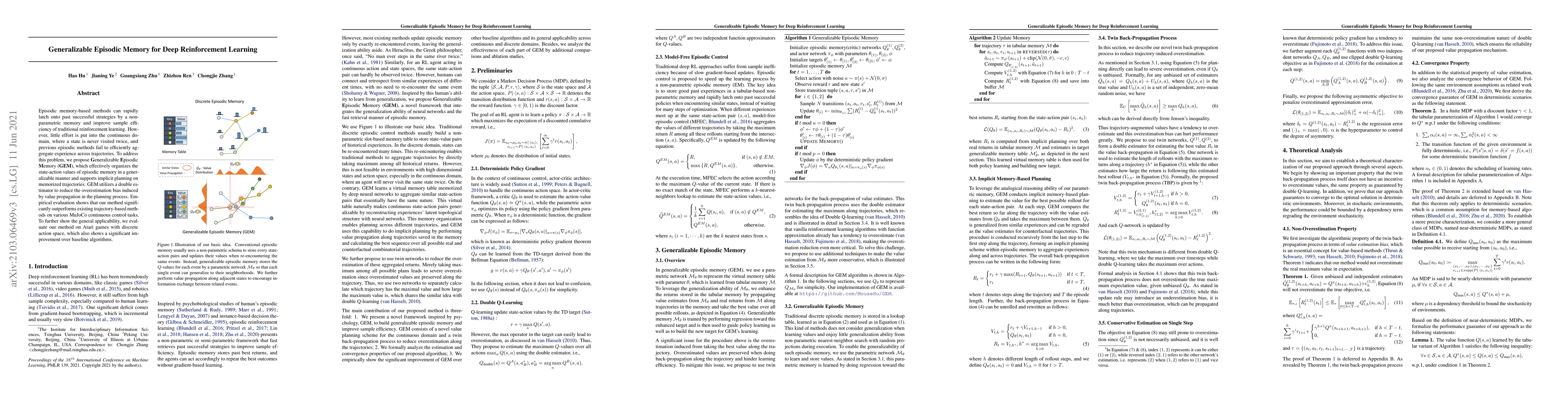 This paper proposes Generalizable Episodic Memory (GEM) to enhance sample efficiency in continuous reinforcement learning by organizing episodic memory in a generalizable way. GEM uses a double estimator to mitigate overestimation bias and outperforms existing methods on both MuJoCo tasks and Atari games.
