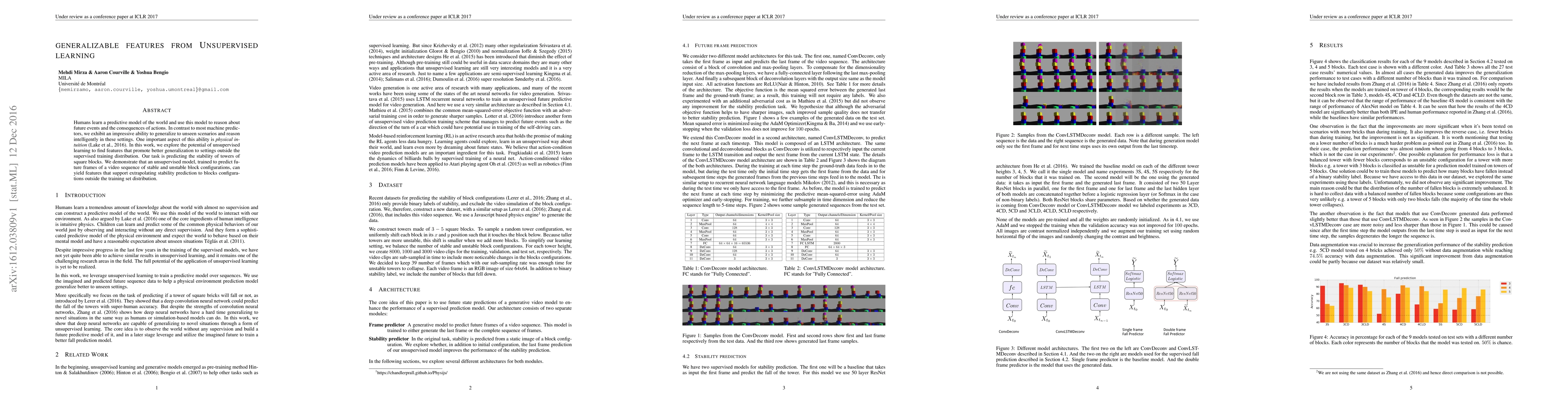 Humans learn a predictive model of the world and use this model to reason about future events and the consequences of actions. In contrast to most machine predictors, we exhibit an impressive ability to generalize to unseen scenarios and reason intelligently in these settings. One important aspect of this ability is physical intuition(Lake et al., 2016). In this work, we explore the potential of unsupervised learning to find features that promote better generalization to settings outside the supervised training distribution. Our task is predicting the stability of towers of square blocks. We demonstrate that an unsupervised model, trained to predict future frames of a video sequence of stable and unstable block configurations, can yield features that support extrapolating stability prediction to blocks configurations outside the training set distribution