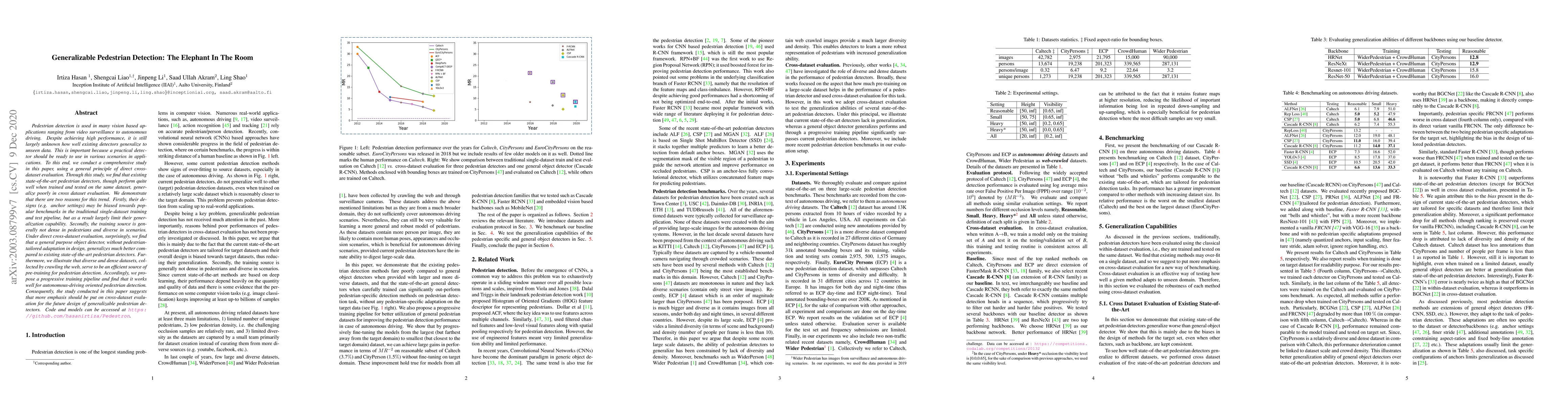 Pedestrian detection is used in many vision based applications ranging from video surveillance to autonomous driving. Despite achieving high performance, it is still largely unknown how well existing detectors generalize to unseen data. This is important because a practical detector should be ready to use in various scenarios in applications. To this end, we conduct a comprehensive study in this paper, using a general principle of direct cross-dataset evaluation. Through this study, we find that existing state-of-the-art pedestrian detectors, though perform quite well when trained and tested on the same dataset, generalize poorly in cross dataset evaluation. We demonstrate that there are two reasons for this trend. Firstly, their designs (e.g. anchor settings) may be biased towards popular benchmarks in the traditional single-dataset training and test pipeline, but as a result largely limit their generalization capability. Secondly, the training source is generally not dense in pedestrians and diverse in scenarios. Under direct cross-dataset evaluation, surprisingly, we find that a general purpose object detector, without pedestrian-tailored adaptation in design, generalizes much better compared to existing state-of-the-art pedestrian detectors. Furthermore, we illustrate that diverse and dense datasets, collected by crawling the web, serve to be an efficient source of pre-training for pedestrian detection. Accordingly, we propose a progressive training pipeline and find that it works well for autonomous-driving oriented pedestrian detection. Consequently, the study conducted in this paper suggests that more emphasis should be put on cross-dataset evaluation for the future design of generalizable pedestrian detectors. Code and models can be accessed at https://github.com/hasanirtiza/Pedestron.