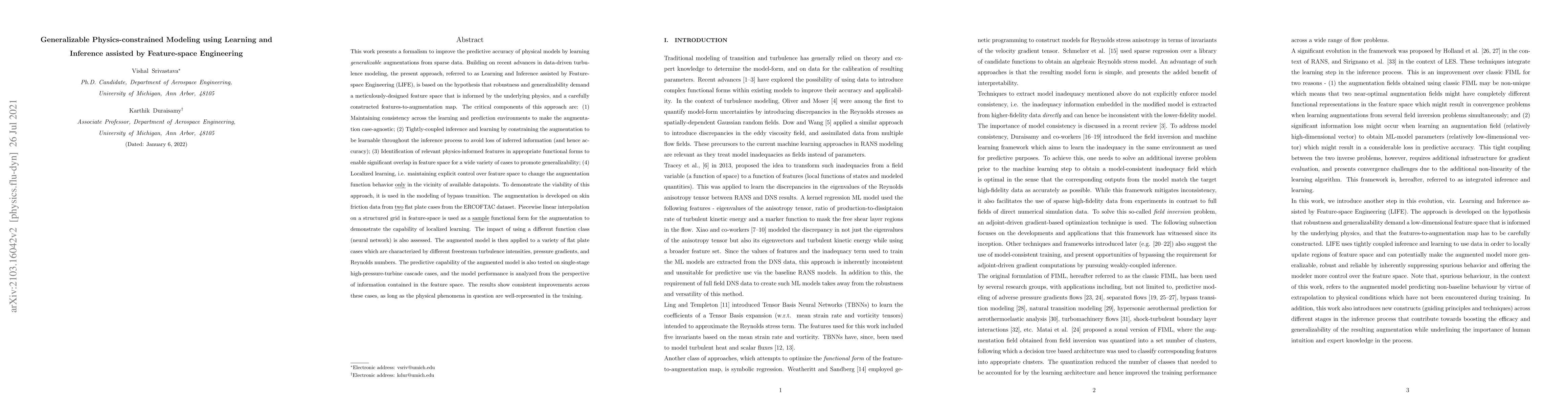 This work presents a formalism to improve the predictive accuracy of physical models by learning generalizable augmentations from sparse data. Building on recent advances in data-driven turbulence modeling, the present approach, referred to as Learning and Inference assisted by Feature-space Engineering (LIFE), is based on the hypothesis that robustness and generalizability demand a meticulously-designed feature space that is informed by the underlying physics, and a carefully constructed features-to-augmentation map. The critical components of this approach are: (1) Maintaining consistency across the learning and prediction environments; (2) Tightly-coupled inference and learning by constraining the augmentation to be learnable throughout the inference process; (3) Identification of relevant physics-informed features in appropriate functional forms to enable significant overlap in feature space for a wide variety of cases to promote generalizability; (4) Maintaining explicit control over feature space to change the augmentation function behavior only in the vicinity of available datapoints. To demonstrate the viability of this approach, it is used in the modeling of bypass transition. The augmentation is developed on skin friction data from two flat plate cases from the ERCOFTAC dataset. Piecewise linear interpolation on a structured grid in feature-space is used as a sample functional form for the augmentation to demonstrate the capability of localized learning. The augmented model is then applied to a variety of flat plate cases which are characterized by different freestream turbulence intensities, pressure gradients, and Reynolds numbers. The predictive capability of the augmented model is also tested on single-stage high-pressure-turbine cascade cases, and the model performance is analyzed from the perspective of information contained in the feature space.