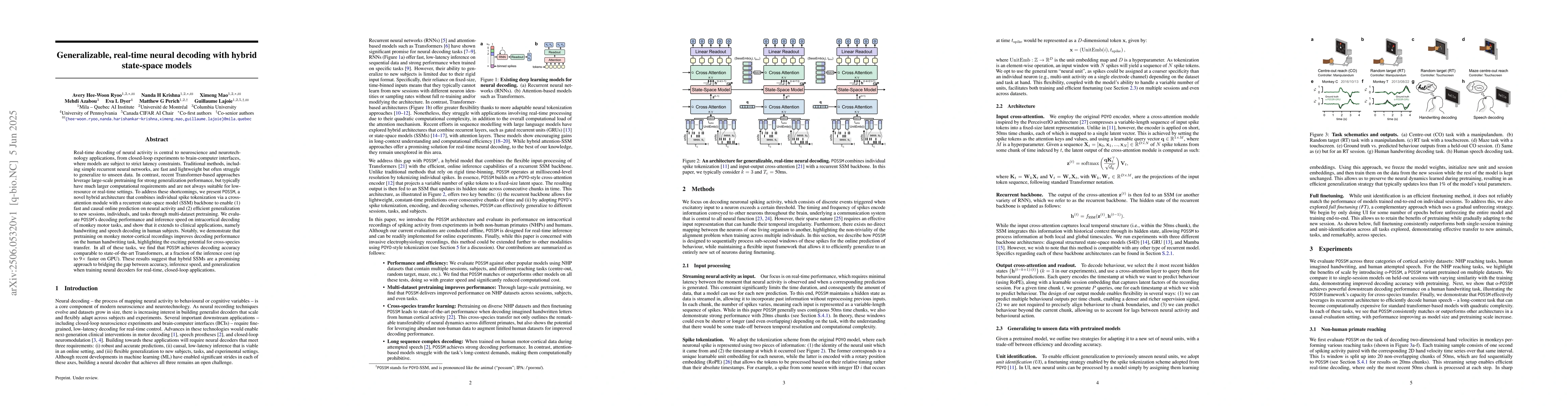 The research introduces POSSM, a hybrid neural decoding model that combines spike tokenization with a recurrent state-space model. POSSM offers real-time, low-latency decoding with strong generalization to unseen data across species, outperforming traditional and Transformer-based methods in speed and accuracy for tasks like monkey motor decoding and human handwriting/speech decoding, demonstrating potential for neuroscience and neurotechnology applications.