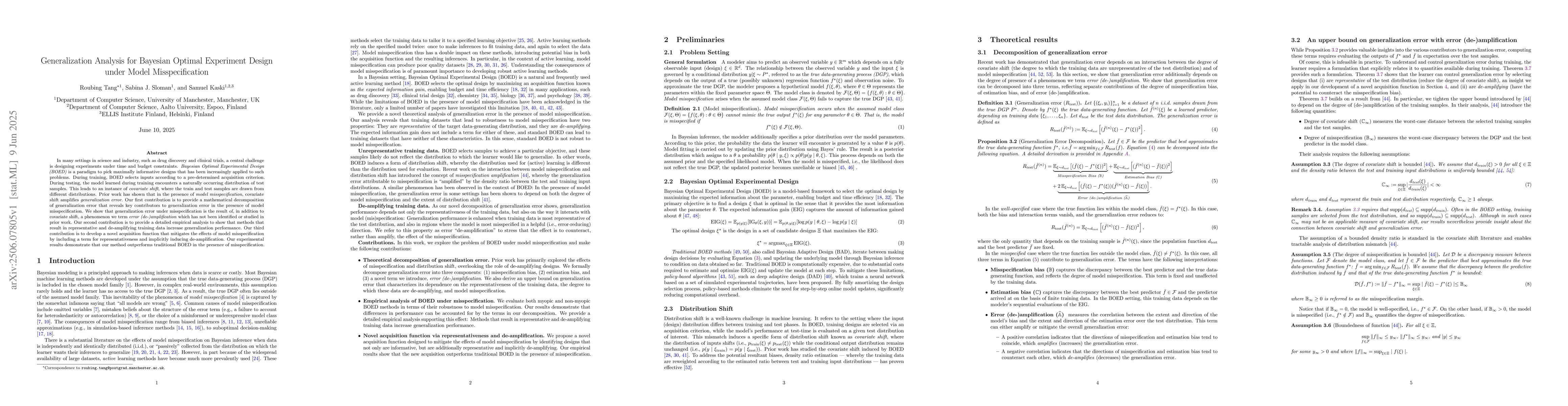In many settings in science and industry, such as drug discovery and clinical trials, a central challenge is designing experiments under time and budget constraints. Bayesian Optimal Experimental Design (BOED) is a paradigm to pick maximally informative designs that has been increasingly applied to such problems. During training, BOED selects inputs according to a pre-determined acquisition criterion. During testing, the model learned during training encounters a naturally occurring distribution of test samples. This leads to an instance of covariate shift, where the train and test samples are drawn from different distributions. Prior work has shown that in the presence of model misspecification, covariate shift amplifies generalization error. Our first contribution is to provide a mathematical decomposition of generalization error that reveals key contributors to generalization error in the presence of model misspecification. We show that generalization error under misspecification is the result of, in addition to covariate shift, a phenomenon we term error (de-)amplification which has not been identified or studied in prior work. Our second contribution is to provide a detailed empirical analysis to show that methods that result in representative and de-amplifying training data increase generalization performance. Our third contribution is to develop a novel acquisition function that mitigates the effects of model misspecification by including a term for representativeness and implicitly inducing de-amplification. Our experimental results demonstrate that our method outperforms traditional BOED in the presence of misspecification.