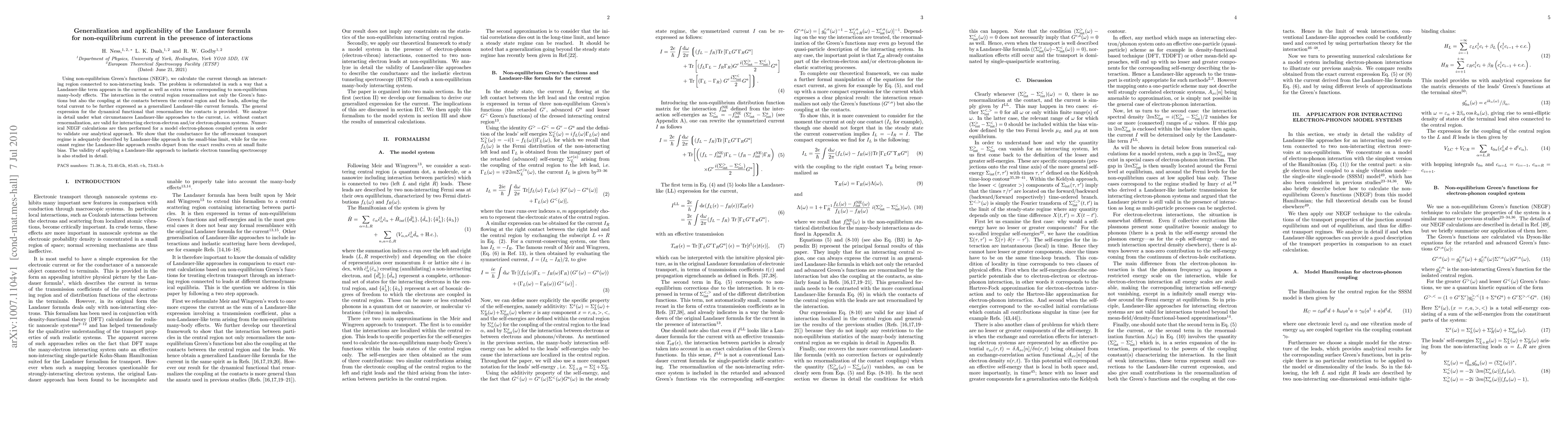 Using non-equilibrium Green's functions (NEGF), we calculate the current through an interacting region connected to non-interacting leads. The problem is reformulated in such a way that a Landauer-like term appears in the current as well as extra terms corresponding to non-equilibrium many-body effects. The interaction in the central region renormalizes not only the Green's functions but also the coupling at the contacts between the central region and the leads, allowing the total current to be further expressed as a generalized Landauer-like current formula. The general expression for the dynamical functional that renormalizes the contacts is provided. We analyze in detail under what circumstances Landauer-like approaches to the current, i.e. without contact renormalization, are valid for interacting electron-electron and/or electron-phonon systems. Numerical NEGF calculations are then performed for a model electron-phonon coupled system in order to validate our analytical approach. We show that the conductance for the off-resonant transport regime is adequately described by Landauer-like approach in the small-bias limit, while for the resonant regime the Landauer-like approach results depart from the exact results even at small finite bias. The validity of applying a Landauer-like approach to inelastic electron tunneling spectroscopy is also studied in detail.