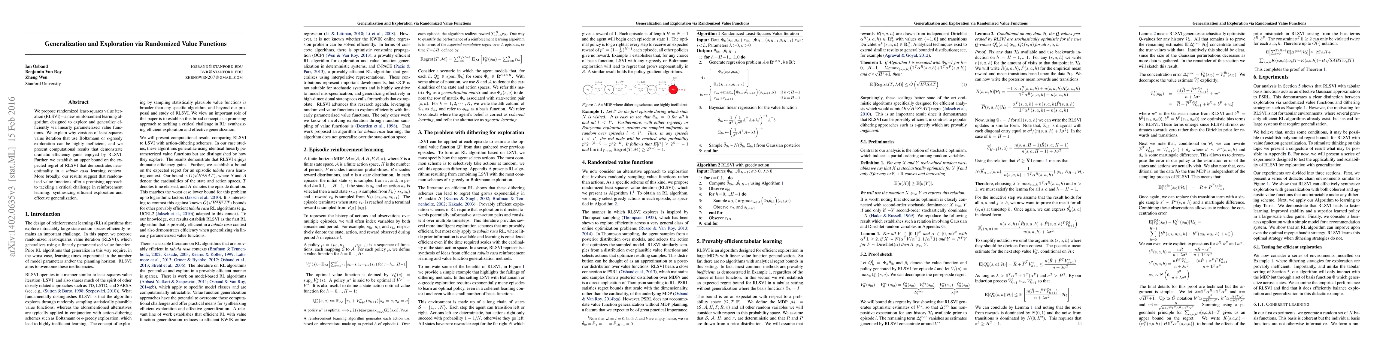 This paper introduces randomized least-squares value iteration (RLSVI), a reinforcement learning algorithm that efficiently explores and generalizes using linearly parameterized value functions. The study demonstrates significant efficiency improvements over traditional methods and establishes an upper bound on RLSVI's regret, indicating its near-optimal performance.
