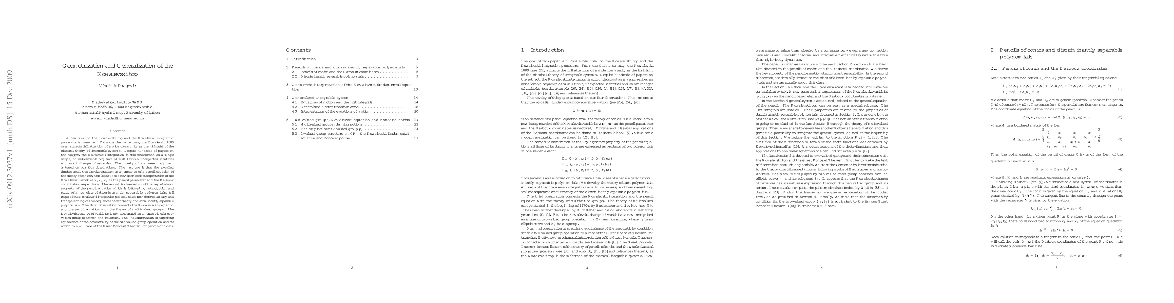 A new view on the Kowalevski top and the Kowalevski integration procedure is presented. For more than a century, the Kowalevski 1889 case, attracts full attention of a wide community as the highlight of the classical theory of integrable systems. Despite hundreds of papers on the subject, the Kowalevski integration is still understood as a magic recipe, an unbelievable sequence of skilful tricks, unexpected identities and smart changes of variables. The novelty of our present approach is based on our four observations. The first one is that the so-called fundamental Kowalevski equation is an instance of a pencil equation of the theory of conics which leads us to a new geometric interpretation of the Kowalevski variables $w, x_1, x_2$ as the pencil parameter and the Darboux coordinates, respectively. The second is observation of the key algebraic property of the pencil equation which is followed by introduction and study of a new class of {\bf discriminantly separable polynomials}. All steps of the Kowalevski integration procedure are now derived as easy and transparent logical consequences of our theory of discriminantly separable polynomials. The third observation connects the Kowalevski integration and the pencil equation with the theory of multi-valued groups. The Kowalevski change of variables is now recognized as an example of a two-valued group operation and its action. The final observation is surprising equivalence of the associativity of the two-valued group operation and its action to $n=3$ case of the Great Poncelet Theorem for pencils of conics.