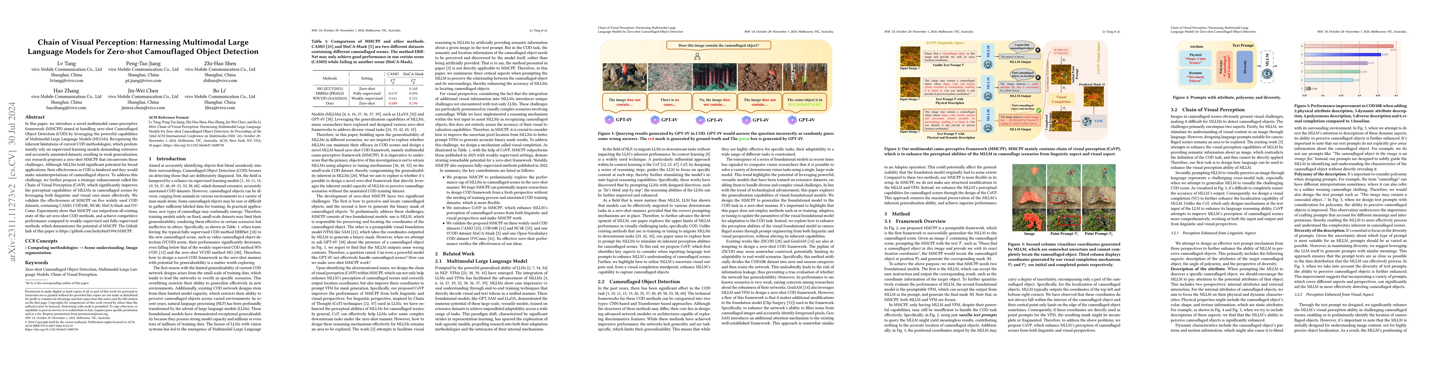 This paper introduces a novel framework, CPVLF, to investigate the generalization of large vision-language models (LVLM) to camouflaged object detection without additional training. It identifies hallucination issues within LVLM that lead to erroneous perceptions of camouflaged objects, proposing a chain of visual perception to mitigate these issues and improve localization accuracy.