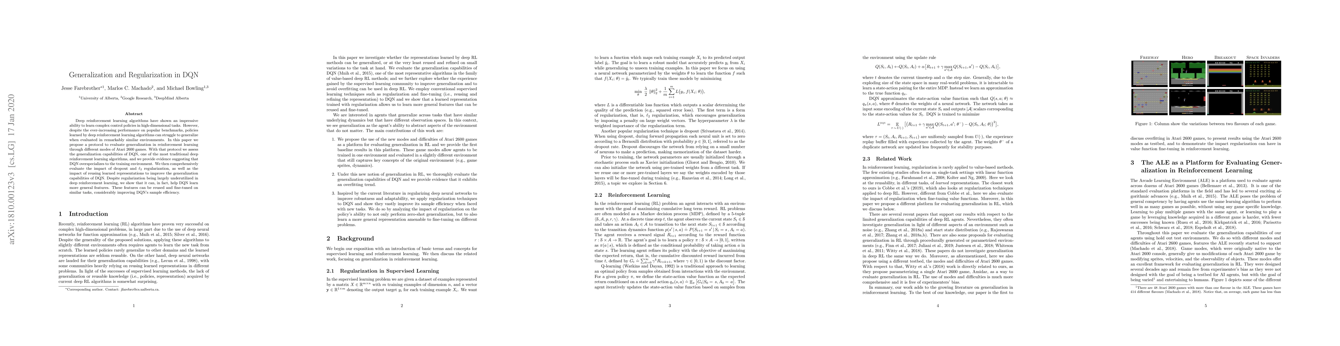 This paper evaluates the generalization capabilities of DQN in Atari 2600 games and finds that DQN overspecializes to training environments. It demonstrates that regularization techniques like dropout and $\ell_2$ regularization, along with reusing learned representations, can significantly improve DQN's generalization and sample efficiency.