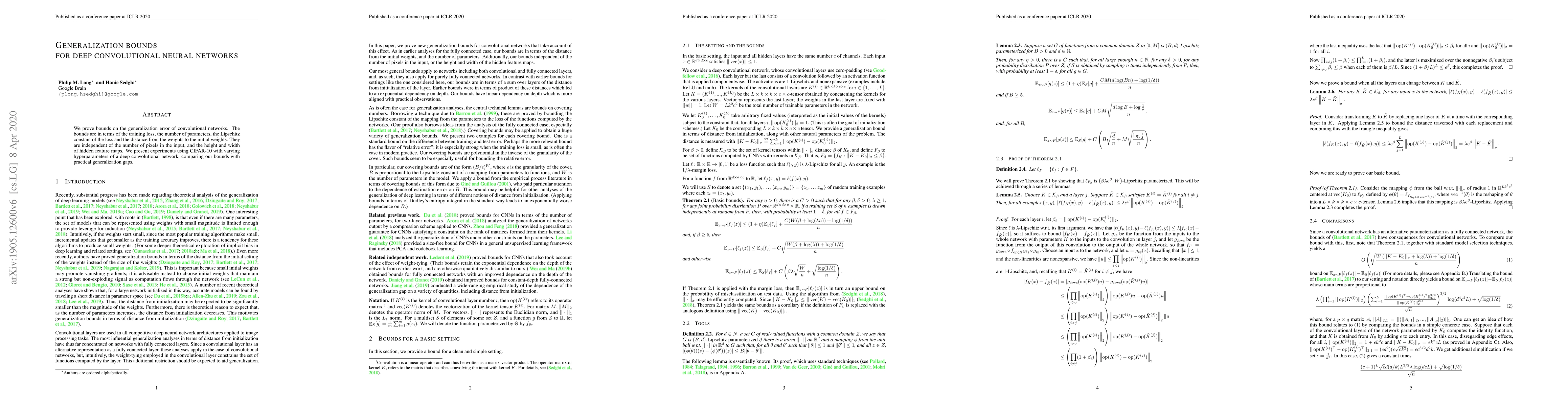 This paper establishes generalization error bounds for deep convolutional neural networks, relating them to training loss, parameters, Lipschitz constant, and weight initialization. Experimental results on CIFAR-10 demonstrate the practical relevance of these bounds against actual generalization gaps.