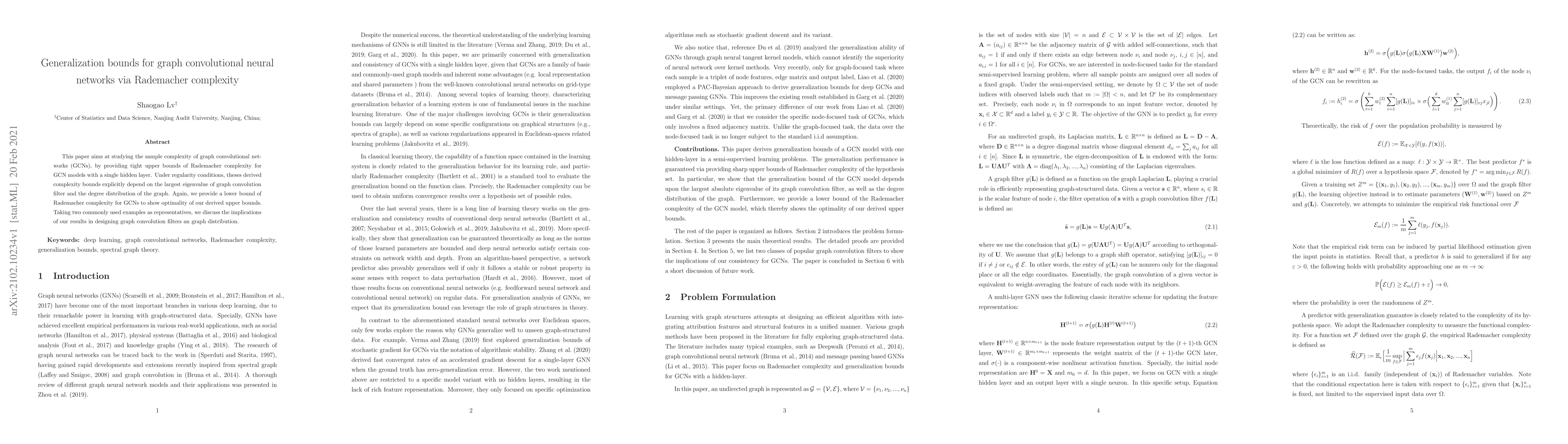 This paper aims at studying the sample complexity of graph convolutional networks (GCNs), by providing tight upper bounds of Rademacher complexity for GCN models with a single hidden layer. Under regularity conditions, theses derived complexity bounds explicitly depend on the largest eigenvalue of graph convolution filter and the degree distribution of the graph. Again, we provide a lower bound of Rademacher complexity for GCNs to show optimality of our derived upper bounds. Taking two commonly used examples as representatives, we discuss the implications of our results in designing graph convolution filters an graph distribution.