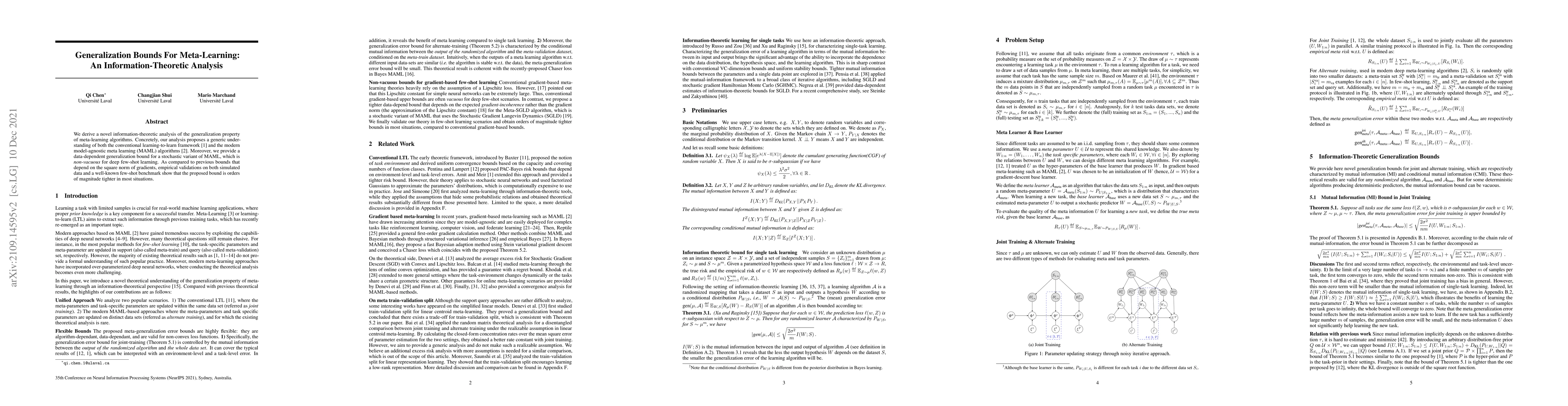 This paper presents an information-theoretic analysis of meta-learning algorithms, providing tighter generalization bounds compared to previous methods. It specifically offers a data-dependent bound for a stochastic variant of MAML, demonstrating significant improvement in few-shot learning scenarios.