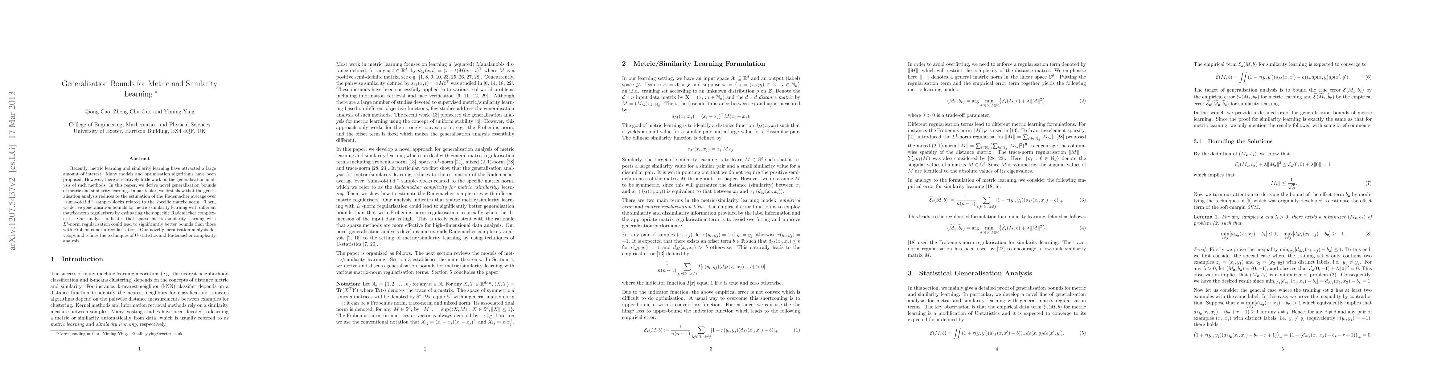 Recently, metric learning and similarity learning have attracted a large amount of interest. Many models and optimisation algorithms have been proposed. However, there is relatively little work on the generalization analysis of such methods. In this paper, we derive novel generalization bounds of metric and similarity learning. In particular, we first show that the generalization analysis reduces to the estimation of the Rademacher average over "sums-of-i.i.d." sample-blocks related to the specific matrix norm. Then, we derive generalization bounds for metric/similarity learning with different matrix-norm regularisers by estimating their specific Rademacher complexities. Our analysis indicates that sparse metric/similarity learning with $L^1$-norm regularisation could lead to significantly better bounds than those with Frobenius-norm regularisation. Our novel generalization analysis develops and refines the techniques of U-statistics and Rademacher complexity analysis.