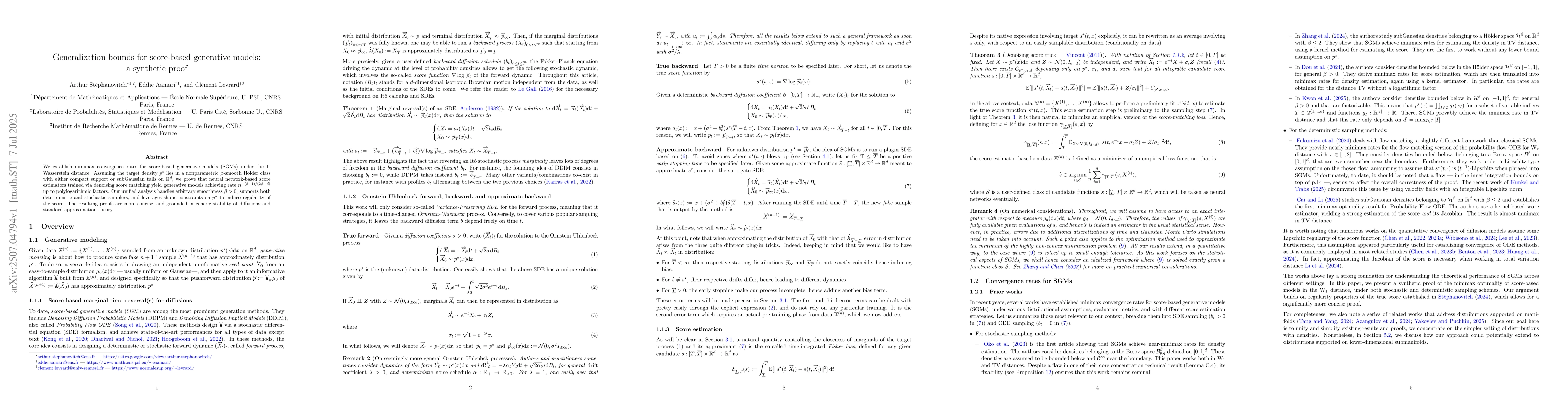 We establish minimax convergence rates for score-based generative models (SGMs) under the $1$-Wasserstein distance. Assuming the target density $p^\star$ lies in a nonparametric $\beta$-smooth H\"older class with either compact support or subGaussian tails on $\mathbb{R}^d$, we prove that neural network-based score estimators trained via denoising score matching yield generative models achieving rate $n^{-(\beta+1)/(2\beta+d)}$ up to polylogarithmic factors. Our unified analysis handles arbitrary smoothness $\beta > 0$, supports both deterministic and stochastic samplers, and leverages shape constraints on $p^\star$ to induce regularity of the score. The resulting proofs are more concise, and grounded in generic stability of diffusions and standard approximation theory.