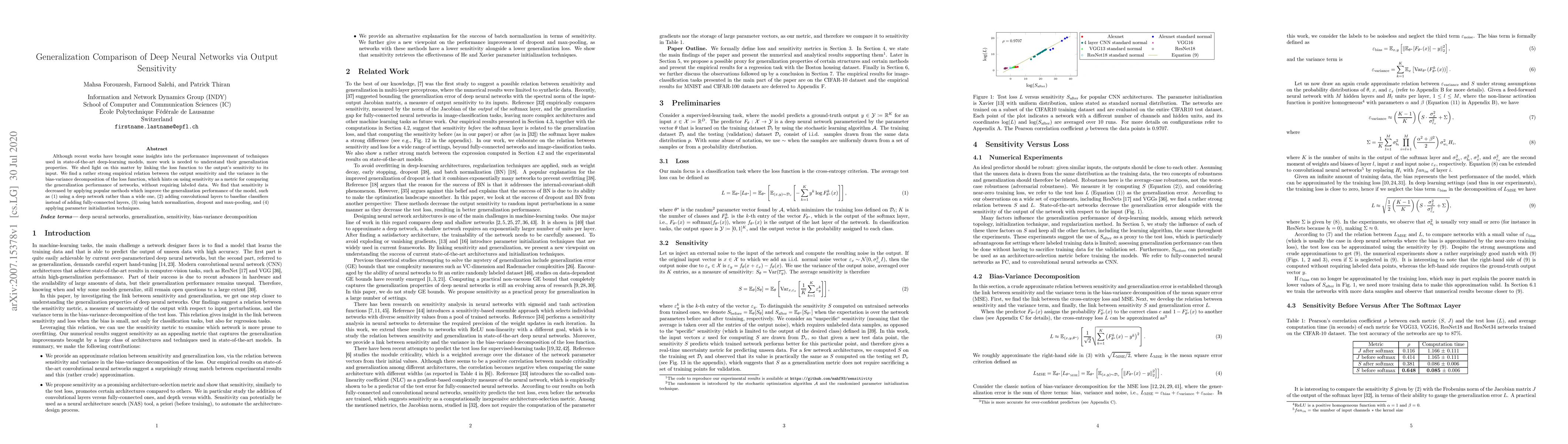 Researchers found that deep neural networks with high output sensitivity have poor generalization performance, while those with low sensitivity generalize better. Sensitivity can serve as a metric to compare network performance without requiring labeled data.
