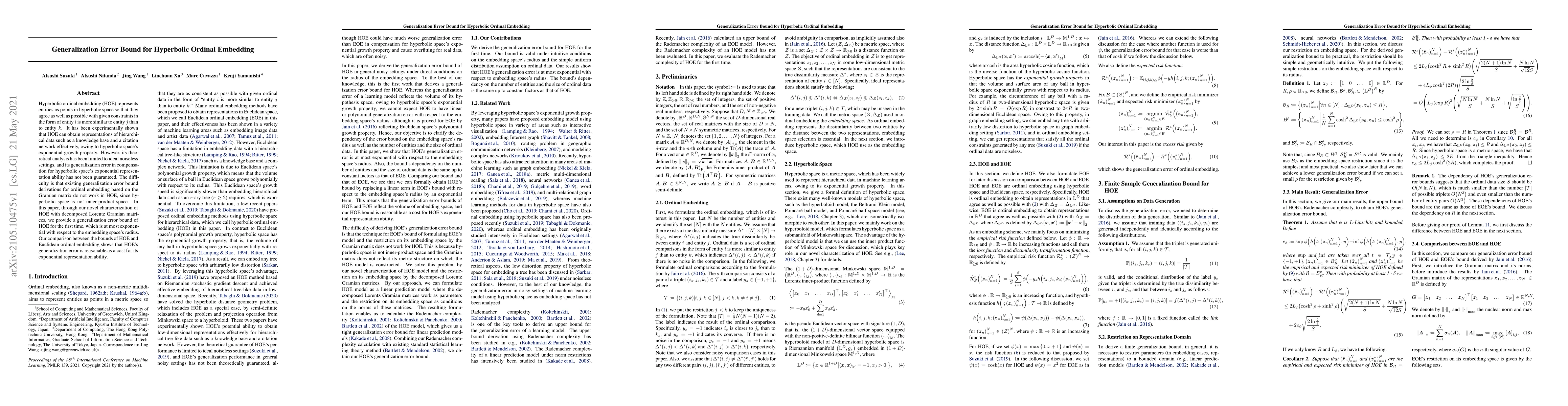 This paper introduces a novel generalization error bound for hyperbolic ordinal embedding (HOE), addressing the lack of theoretical analysis in noisy settings. The authors provide a bound that is exponential with respect to the embedding space's radius, demonstrating HOE's reasonable trade-off between generalization error and its exponential representation capability.