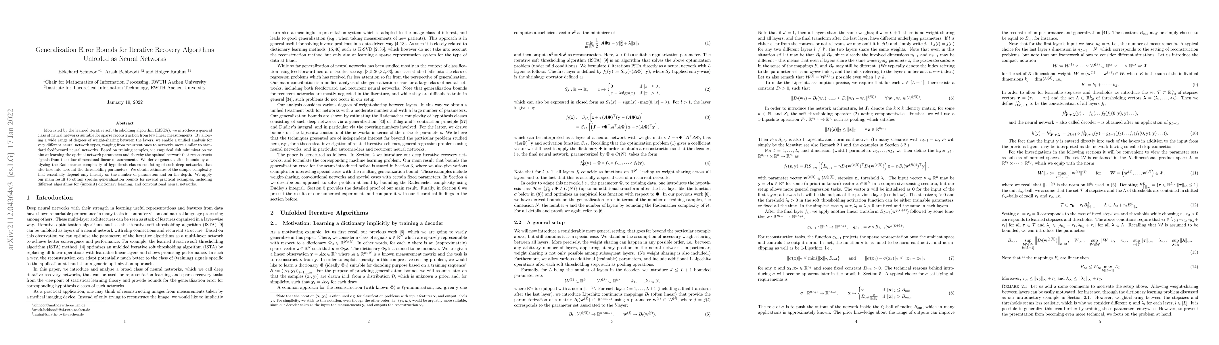 This paper introduces a class of neural networks for sparse signal reconstruction, analyzing their generalization error bounds. It derives sample complexity estimates that depend linearly on the number of parameters and network depth, applying these results to various iterative recovery algorithms and convolutional neural networks.