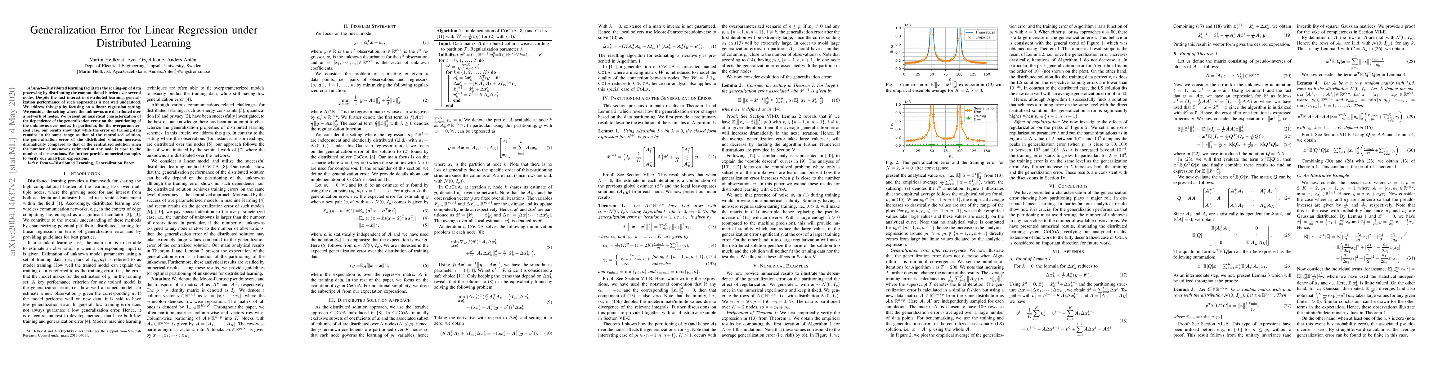 This paper investigates the generalization error in linear regression under distributed learning, finding that while training error remains similar to centralized solutions, the generalization error significantly increases in distributed settings, especially when many unknowns are estimated locally. Analytical results are supported by numerical examples.