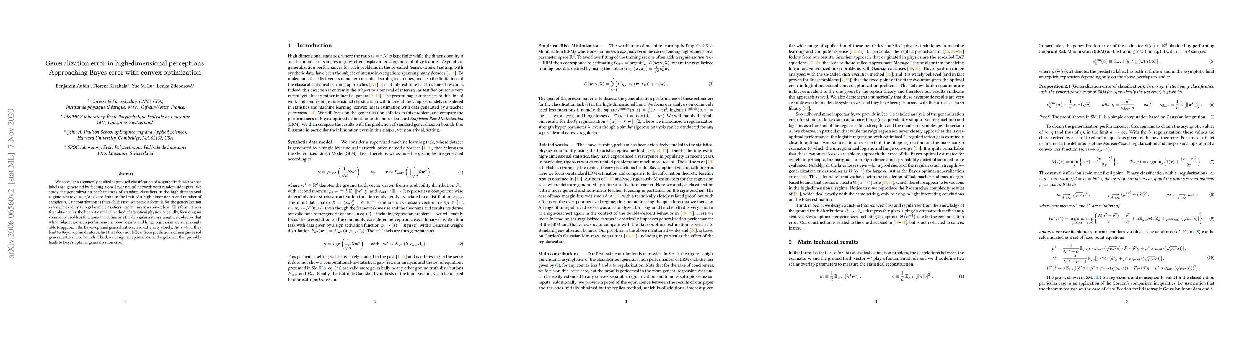 This paper investigates the generalization performance of high-dimensional perceptrons, demonstrating that convex optimization can achieve Bayes-optimal error rates for logistic and hinge regressions. It also develops an optimal loss and regularizer that guarantees Bayes-optimal generalization error.