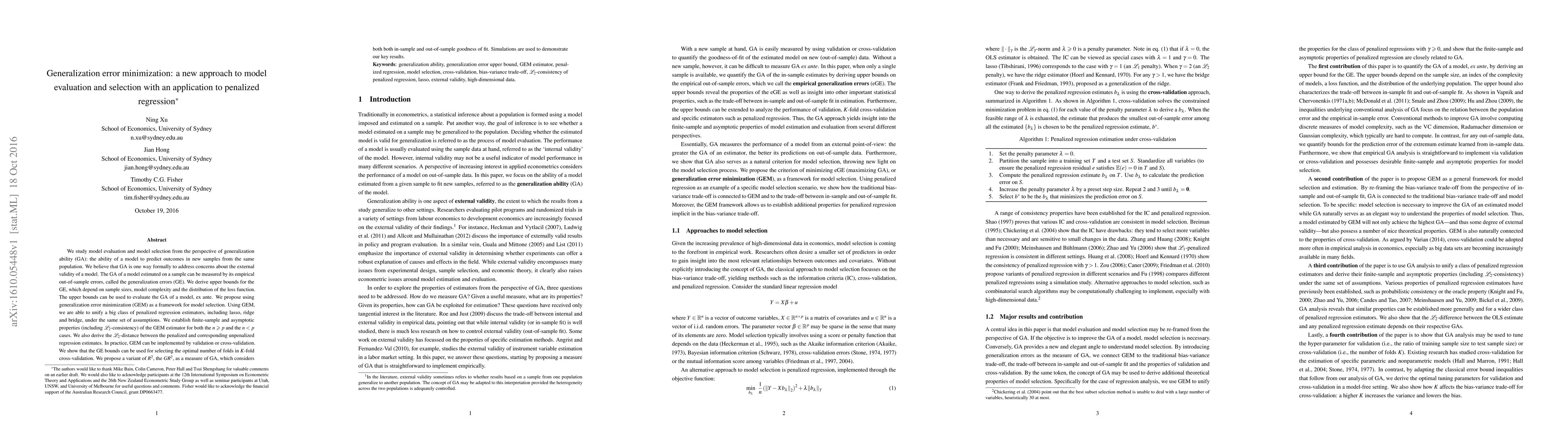 We study model evaluation and model selection from the perspective of generalization ability (GA): the ability of a model to predict outcomes in new samples from the same population. We believe that GA is one way formally to address concerns about the external validity of a model. The GA of a model estimated on a sample can be measured by its empirical out-of-sample errors, called the generalization errors (GE). We derive upper bounds for the GE, which depend on sample sizes, model complexity and the distribution of the loss function. The upper bounds can be used to evaluate the GA of a model, ex ante. We propose using generalization error minimization (GEM) as a framework for model selection. Using GEM, we are able to unify a big class of penalized regression estimators, including lasso, ridge and bridge, under the same set of assumptions. We establish finite-sample and asymptotic properties (including $\mathcal{L}_2$-consistency) of the GEM estimator for both the $n \geqslant p$ and the $n < p$ cases. We also derive the $\mathcal{L}_2$-distance between the penalized and corresponding unpenalized regression estimates. In practice, GEM can be implemented by validation or cross-validation. We show that the GE bounds can be used for selecting the optimal number of folds in $K$-fold cross-validation. We propose a variant of $R^2$, the $GR^2$, as a measure of GA, which considers both both in-sample and out-of-sample goodness of fit. Simulations are used to demonstrate our key results.