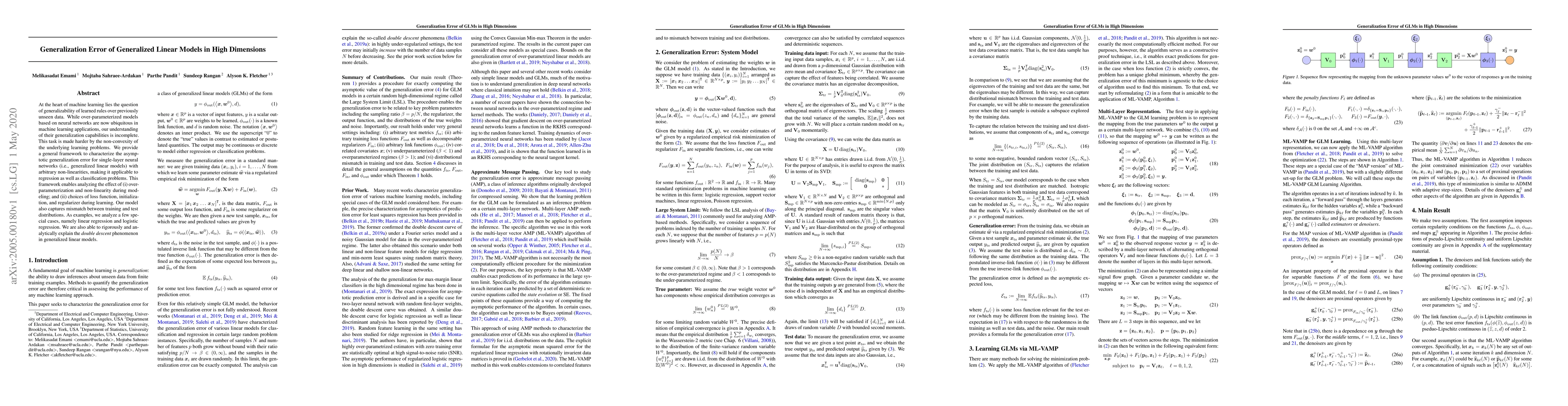 This paper develops a framework to analyze the generalization error of generalized linear models in high dimensions, focusing on over-parameterization and non-linearity effects. It explains the double descent phenomenon and applies the model to linear and logistic regression.