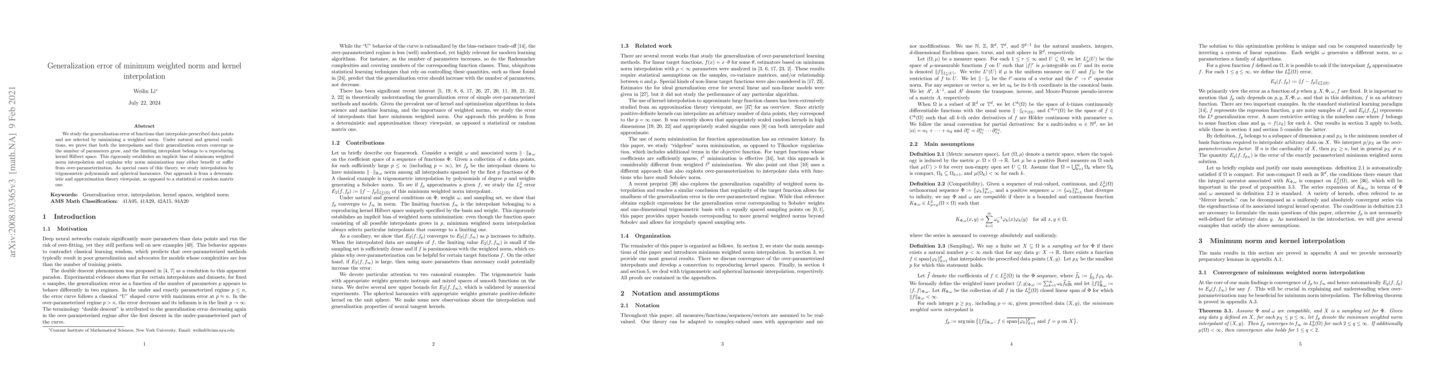 This paper explores the generalization error of functions that interpolate data while minimizing a weighted norm, proving convergence of interpolants and their errors under general conditions. The study reveals the implicit bias of minimum weighted norm interpolation and its implications for over-parameterization, analyzed through trigonometric and spherical harmonic interpolations from a deterministic approximation theory perspective.