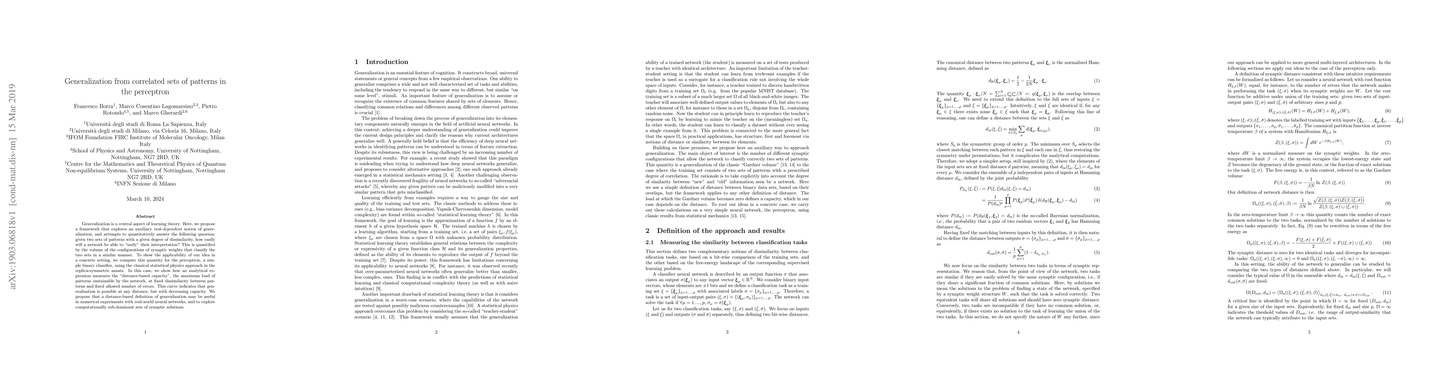 This paper proposes a framework to quantify generalization in neural networks by examining how well a network can unify interpretations of two correlated sets of patterns. Using the perceptron as a model, it computes an analytical expression for "distance-based capacity," showing that generalization is possible but capacity decreases with pattern dissimilarity.