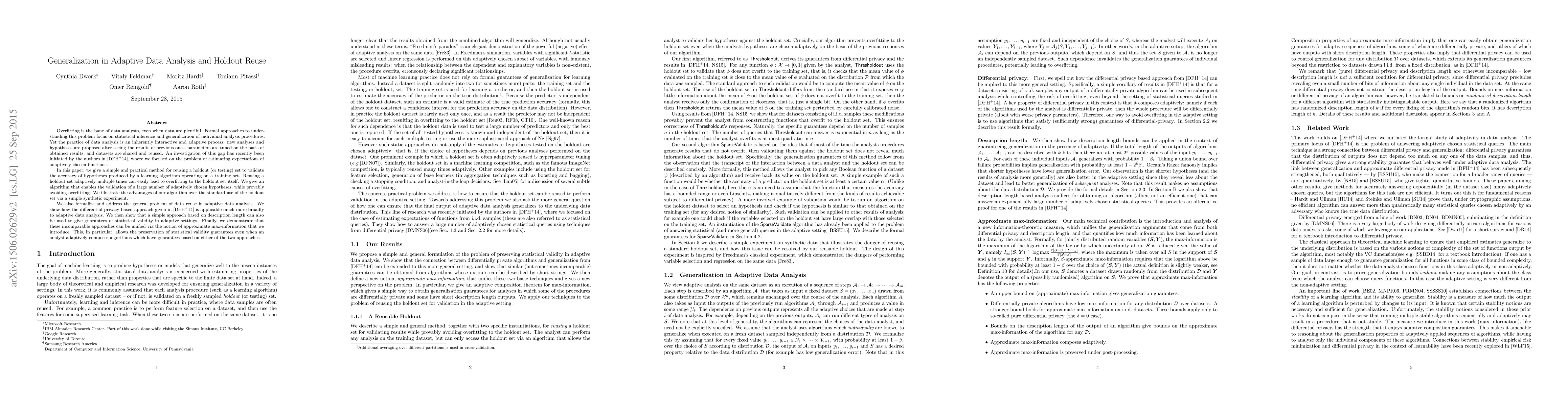 This paper introduces a method to reuse holdout sets in adaptive data analysis without overfitting, ensuring statistical validity. It also unifies differential privacy and description length approaches via approximate max-information notion.