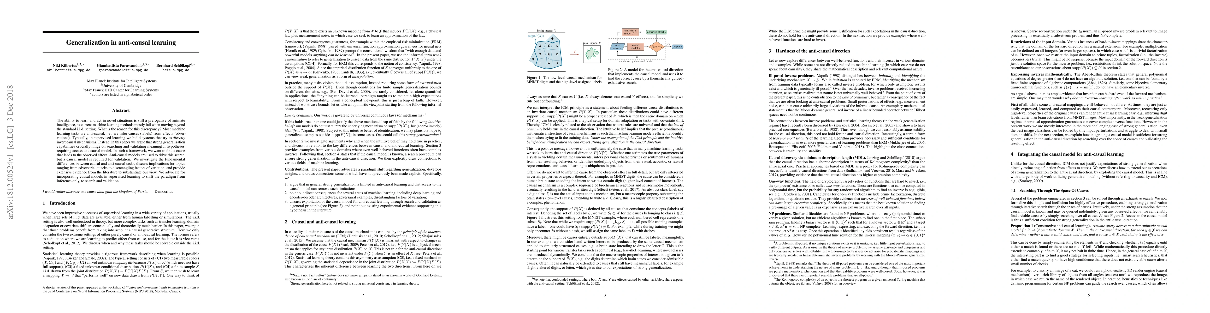 The ability to learn and act in novel situations is still a prerogative of animate intelligence, as current machine learning methods mostly fail when moving beyond the standard i.i.d. setting. What is the reason for this discrepancy? Most machine learning tasks are anti-causal, i.e., we infer causes (labels) from effects (observations). Typically, in supervised learning we build systems that try to directly invert causal mechanisms. Instead, in this paper we argue that strong generalization capabilities crucially hinge on searching and validating meaningful hypotheses, requiring access to a causal model. In such a framework, we want to find a cause that leads to the observed effect. Anti-causal models are used to drive this search, but a causal model is required for validation. We investigate the fundamental differences between causal and anti-causal tasks, discuss implications for topics ranging from adversarial attacks to disentangling factors of variation, and provide extensive evidence from the literature to substantiate our view. We advocate for incorporating causal models in supervised learning to shift the paradigm from inference only, to search and validation.