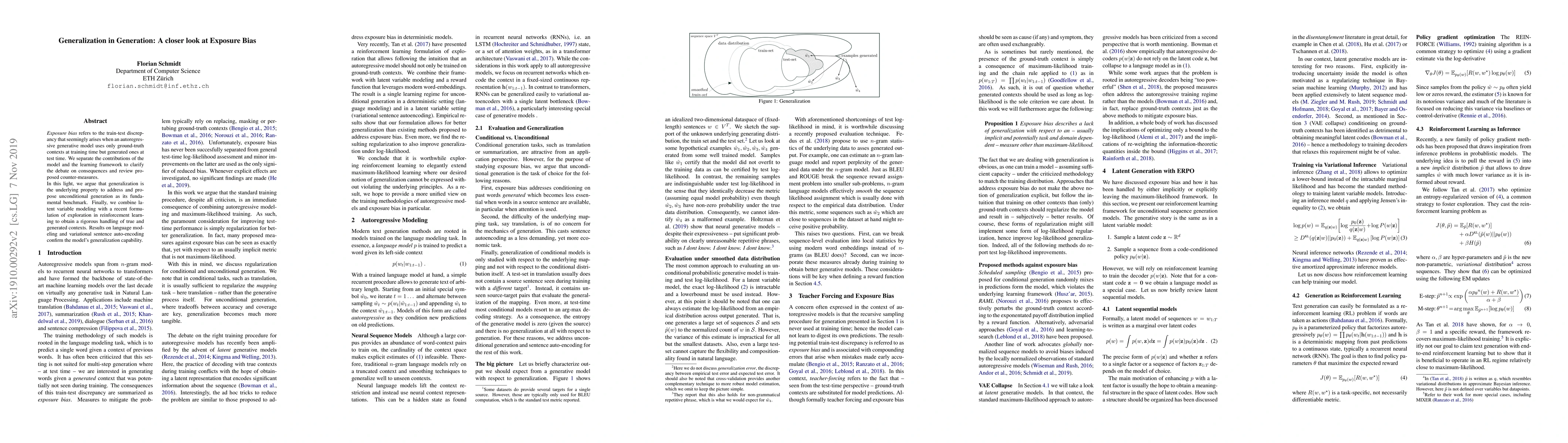Exposure bias refers to the train-test discrepancy that seemingly arises when an autoregressive generative model uses only ground-truth contexts at training time but generated ones at test time. We separate the contributions of the model and the learning framework to clarify the debate on consequences and review proposed counter-measures. In this light, we argue that generalization is the underlying property to address and propose unconditional generation as its fundamental benchmark. Finally, we combine latent variable modeling with a recent formulation of exploration in reinforcement learning to obtain a rigorous handling of true and generated contexts. Results on language modeling and variational sentence auto-encoding confirm the model's generalization capability.