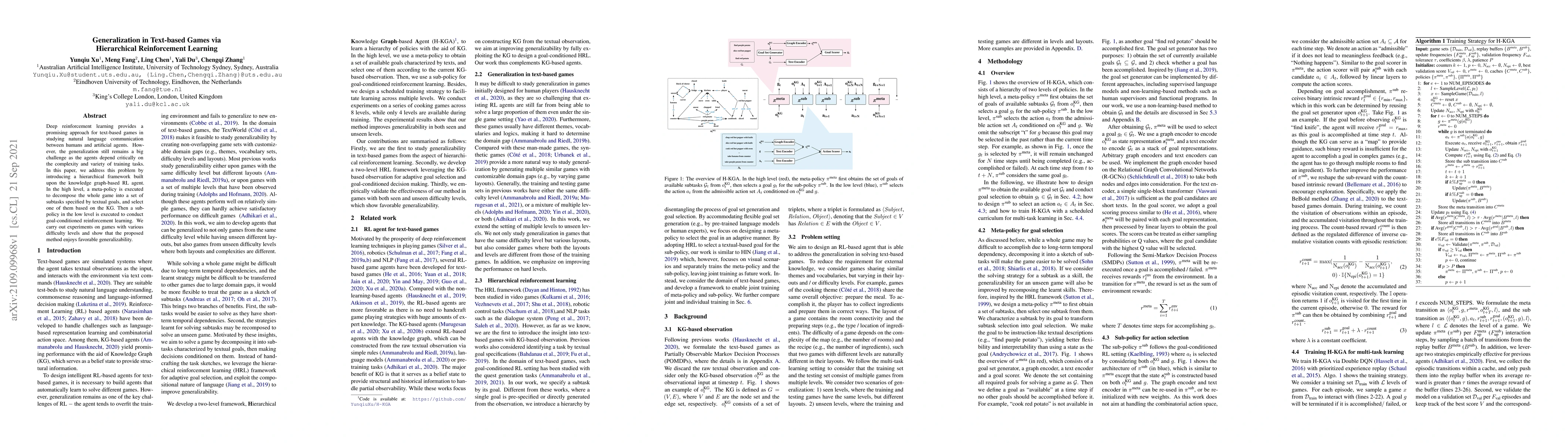 This paper proposes a hierarchical reinforcement learning framework to enhance generalization in text-based games. It employs a meta-policy to decompose games into subtasks and a sub-policy for goal-conditioned learning, demonstrating improved generalizability across different game difficulties.