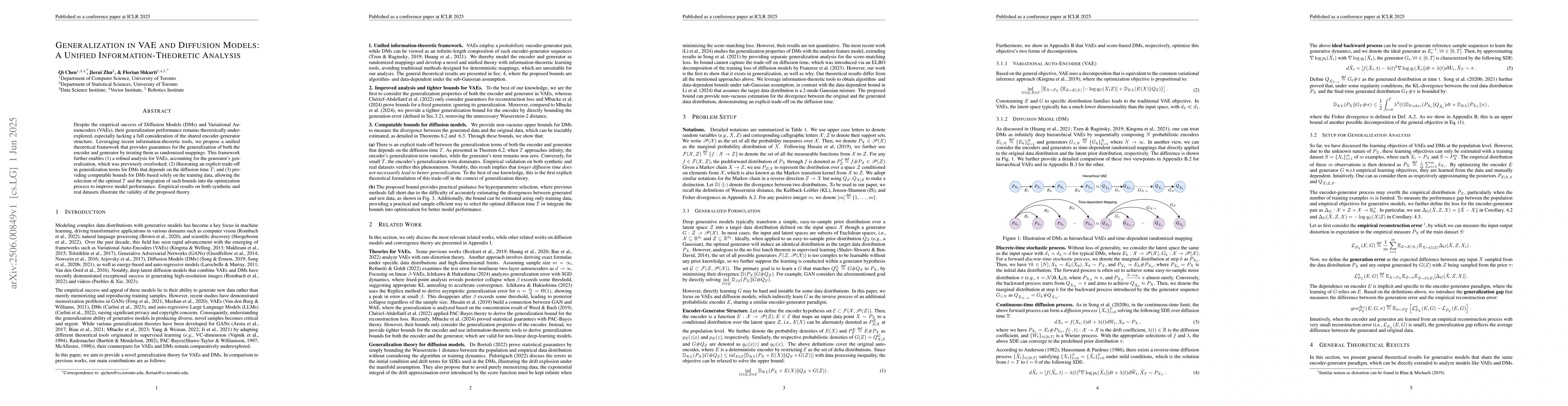 Despite the empirical success of Diffusion Models (DMs) and Variational Autoencoders (VAEs), their generalization performance remains theoretically underexplored, especially lacking a full consideration of the shared encoder-generator structure. Leveraging recent information-theoretic tools, we propose a unified theoretical framework that provides guarantees for the generalization of both the encoder and generator by treating them as randomized mappings. This framework further enables (1) a refined analysis for VAEs, accounting for the generator's generalization, which was previously overlooked; (2) illustrating an explicit trade-off in generalization terms for DMs that depends on the diffusion time $T$; and (3) providing computable bounds for DMs based solely on the training data, allowing the selection of the optimal $T$ and the integration of such bounds into the optimization process to improve model performance. Empirical results on both synthetic and real datasets illustrate the validity of the proposed theory.