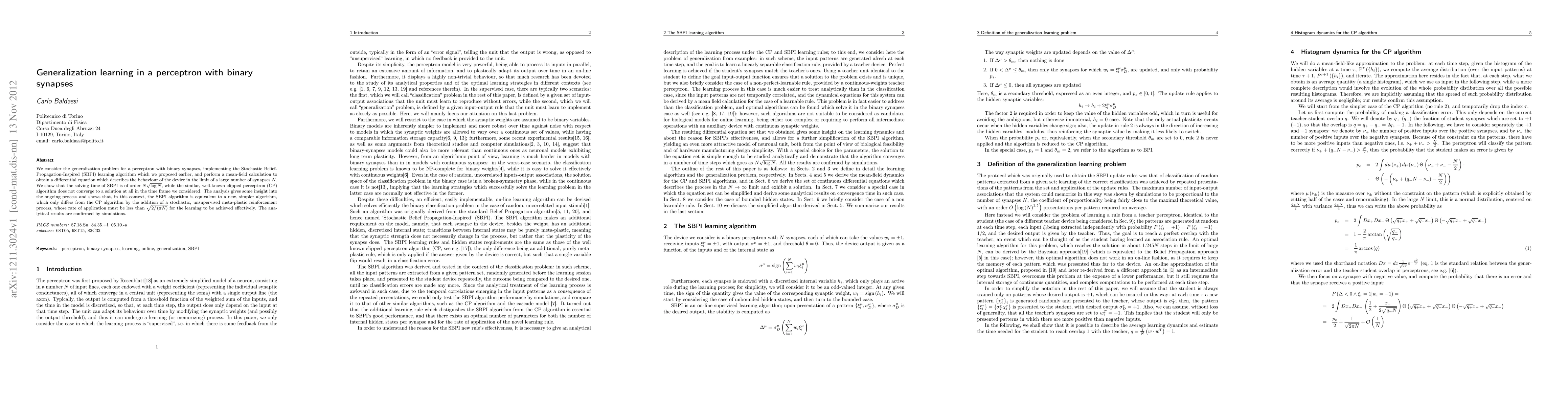 This paper investigates the generalization learning in a perceptron with binary synapses using the Stochastic Belief-Propagation-Inspired (SBPI) algorithm, demonstrating its solving time of order N*sqrt(log(N)). In contrast, the clipped perceptron (CP) algorithm fails to converge within the observed timeframe, highlighting the effectiveness of SBPI enhanced by a stochastic reinforcement process.