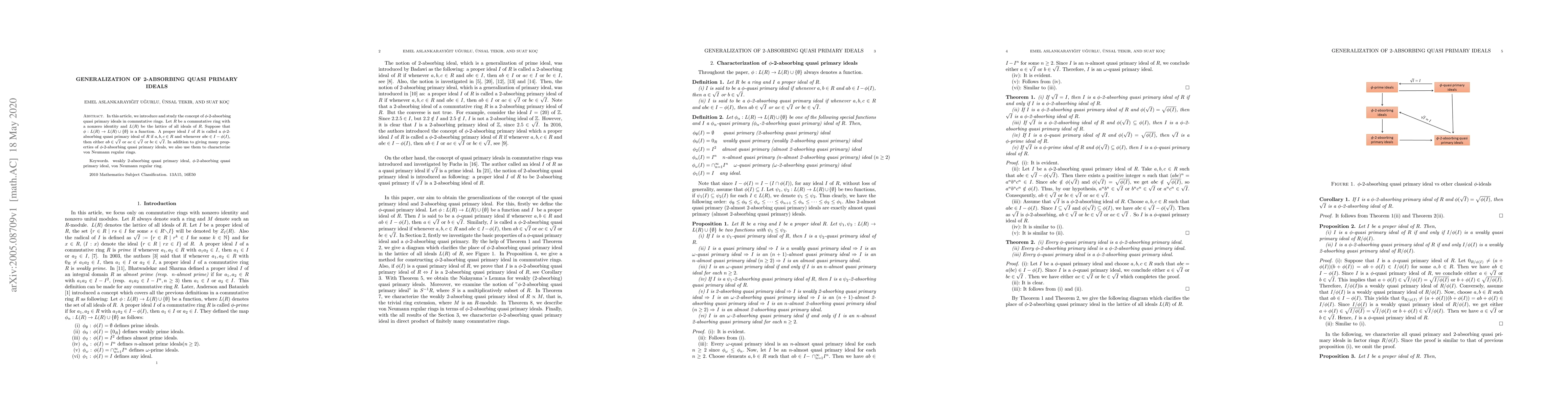 In this article, we introduce and study the concept of $\phi$-2-absorbing quasi primary ideals in commutative rings. Let $R$ be a commutative ring with a nonzero identity and $L(R)$ be the lattice of all ideals of $R$. Suppose that $\phi:L(R)\rightarrow L(R)\cup\left\{ \emptyset\right\} $ is a function. A proper ideal $I$ of $R$ is called a $\phi$-2-absorbing quasiprimary ideal of $R$ if $a,b,c\in R$ and whenever $abc\in I-\phi(I),$ then either $ab\in\sqrt{I}$ or $ac\in\sqrt{I}$ or $bc\in\sqrt{I}$. In addition to giving many properties of $\phi$-2-absorbing quasi primary ideals, we also use them to characterize von Neumann regular rings.