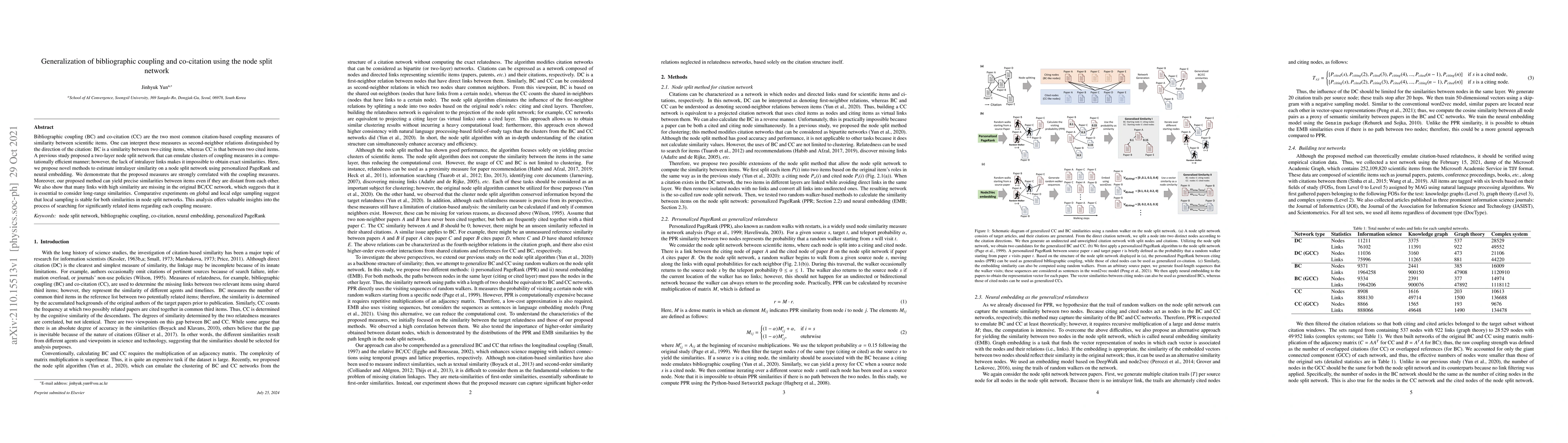 This paper proposes new methods to estimate intralayer similarity in a node split network for bibliographic coupling and co-citation, using personalized PageRank and neural embedding. The results show strong correlation with traditional measures and reveal the importance of considering long-range similarities for precise item relationships.