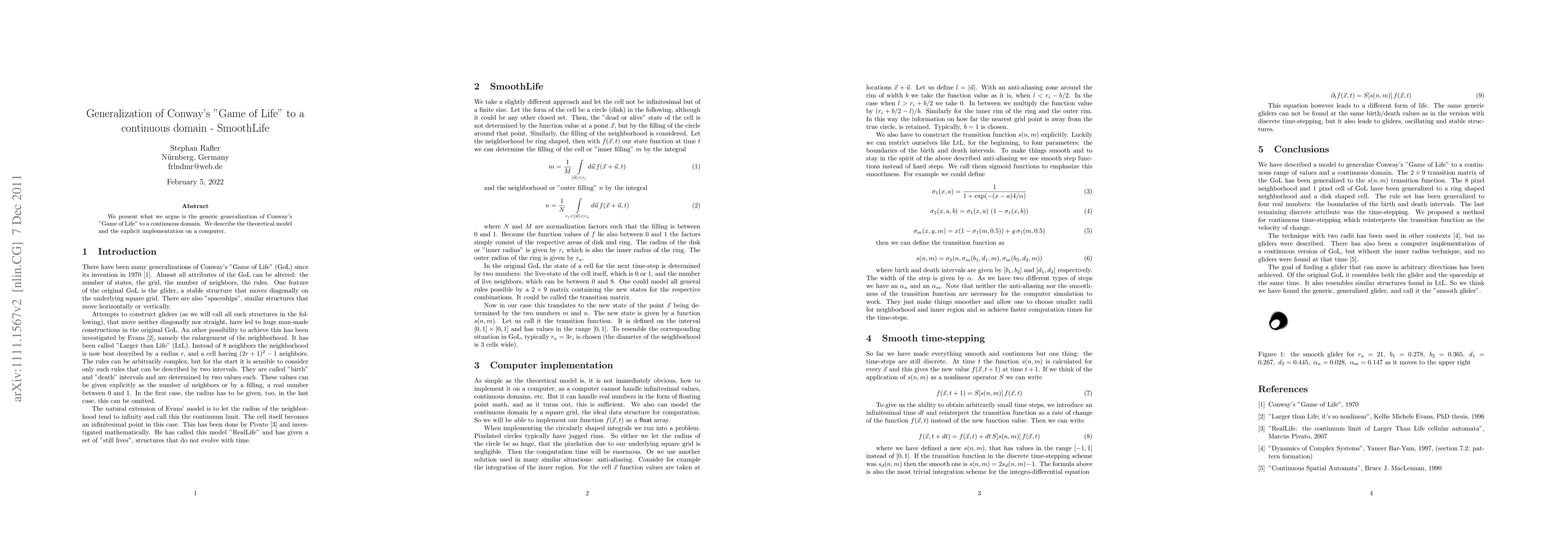 Summary: This paper introduces SmoothLife, a continuous domain generalization of Conway's "Game of Life," detailing both its theoretical model and practical computer implementation. The work aims to extend discrete cellular automata principles to a fluid, continuous environment.