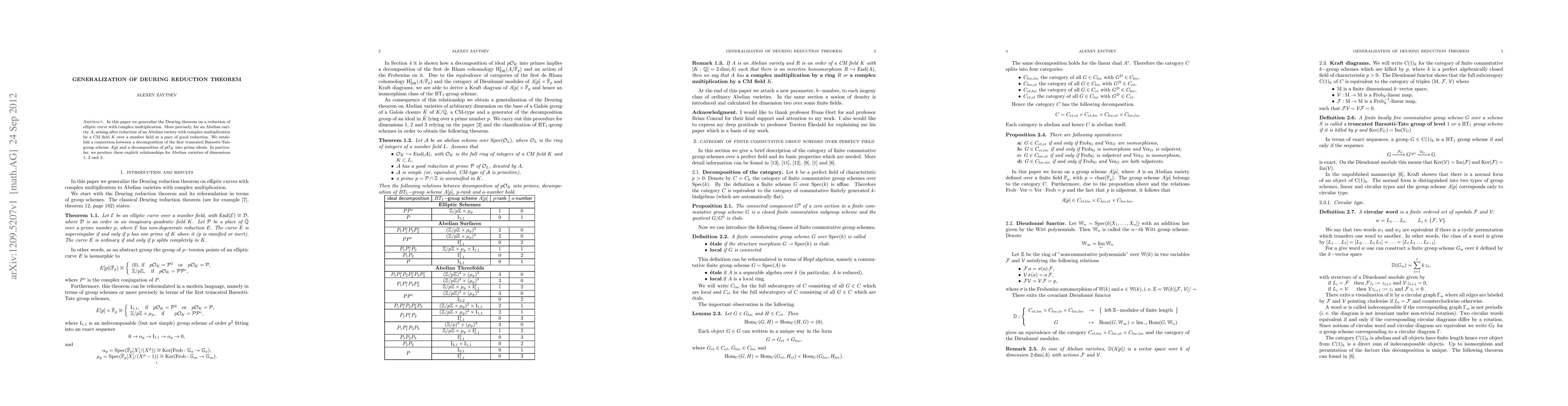 This paper generalizes Deuring's theorem on the reduction of elliptic curves with complex multiplication, establishing a connection between the decomposition of the first truncated Barsotti-Tate group scheme and the decomposition of $p\cO_{K}$ into prime ideals for Abelian varieties of dimensions 1, 2, and 3.