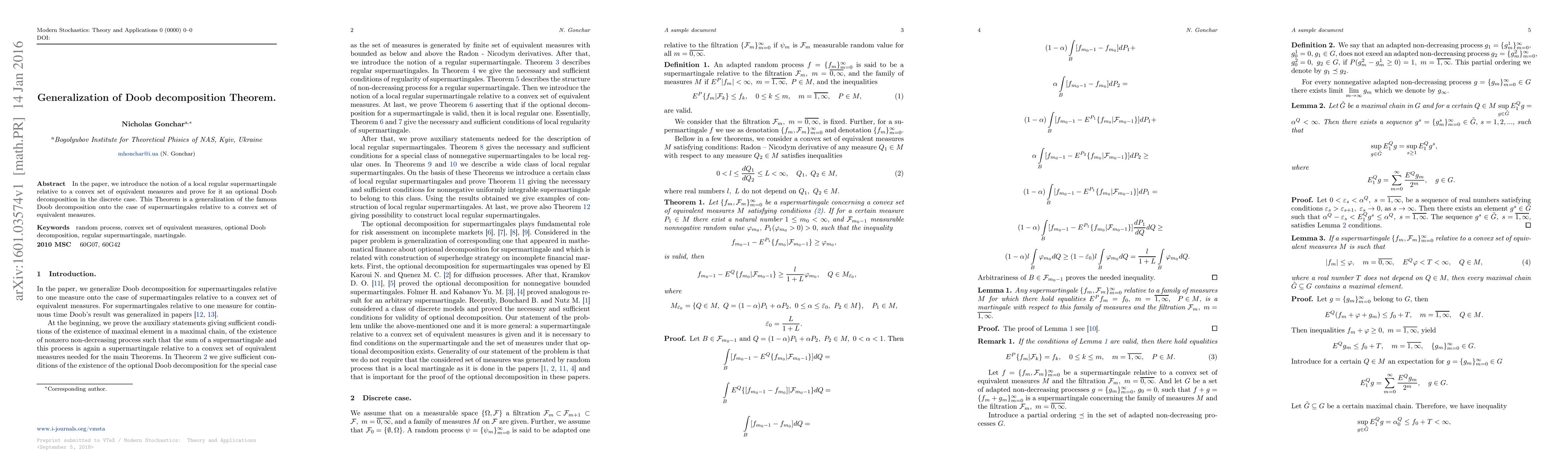 This paper generalizes the Doob decomposition theorem to local regular supermartingales relative to a convex set of equivalent measures, proving an optional decomposition in the discrete case. This extends the classical Doob decomposition to a broader context of supermartingales.