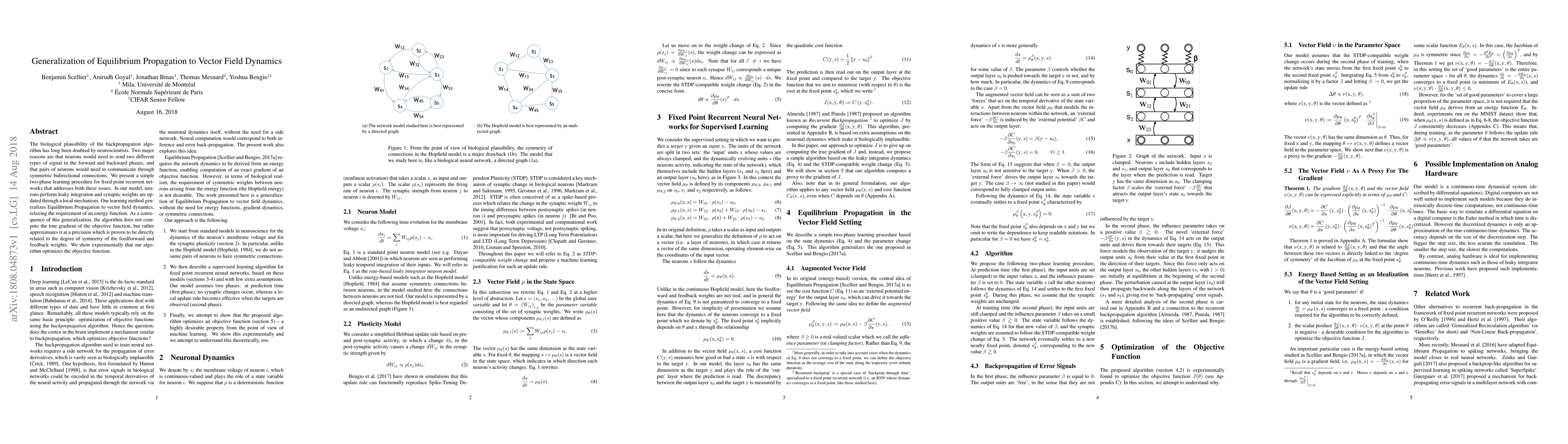 The biological plausibility of the backpropagation algorithm has long been doubted by neuroscientists. Two major reasons are that neurons would need to send two different types of signal in the forward and backward phases, and that pairs of neurons would need to communicate through symmetric bidirectional connections. We present a simple two-phase learning procedure for fixed point recurrent networks that addresses both these issues. In our model, neurons perform leaky integration and synaptic weights are updated through a local mechanism. Our learning method generalizes Equilibrium Propagation to vector field dynamics, relaxing the requirement of an energy function. As a consequence of this generalization, the algorithm does not compute the true gradient of the objective function, but rather approximates it at a precision which is proven to be directly related to the degree of symmetry of the feedforward and feedback weights. We show experimentally that our algorithm optimizes the objective function.