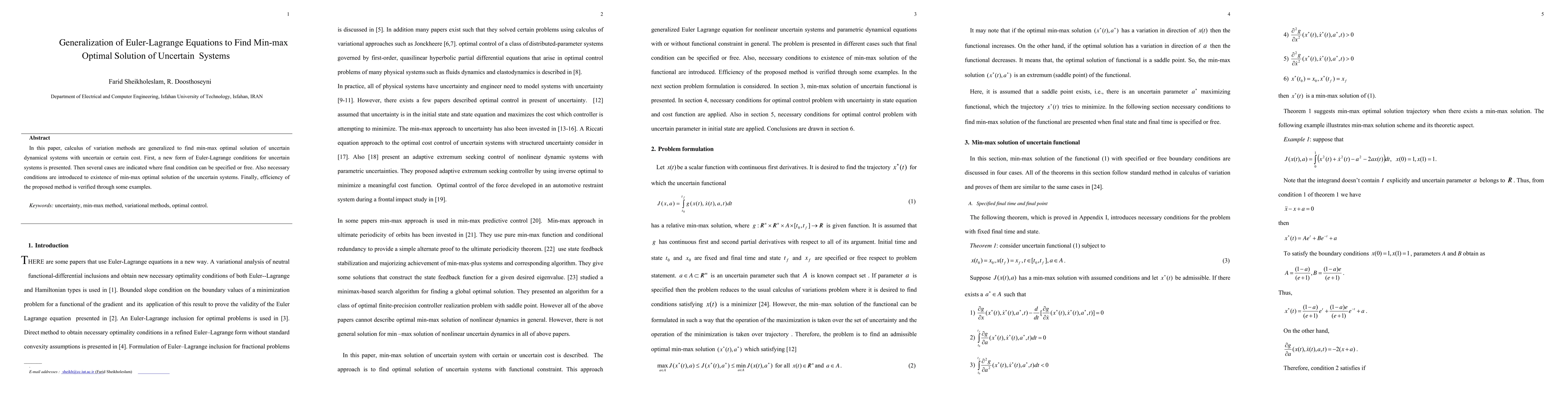 In this paper, calculus of variation methods are generalized to find min-max optimal solution of uncertain dynamical systems with uncertain or certain cost. First, a new form of Euler-Lagrange conditions for uncertain systems is presented. Then several cases are indicated where final condition can be specified or free. Also necessary conditions are introduced to existence of min-max optimal solution of the uncertain systems. Finally, efficiency of the proposed method is verified through some examples.
