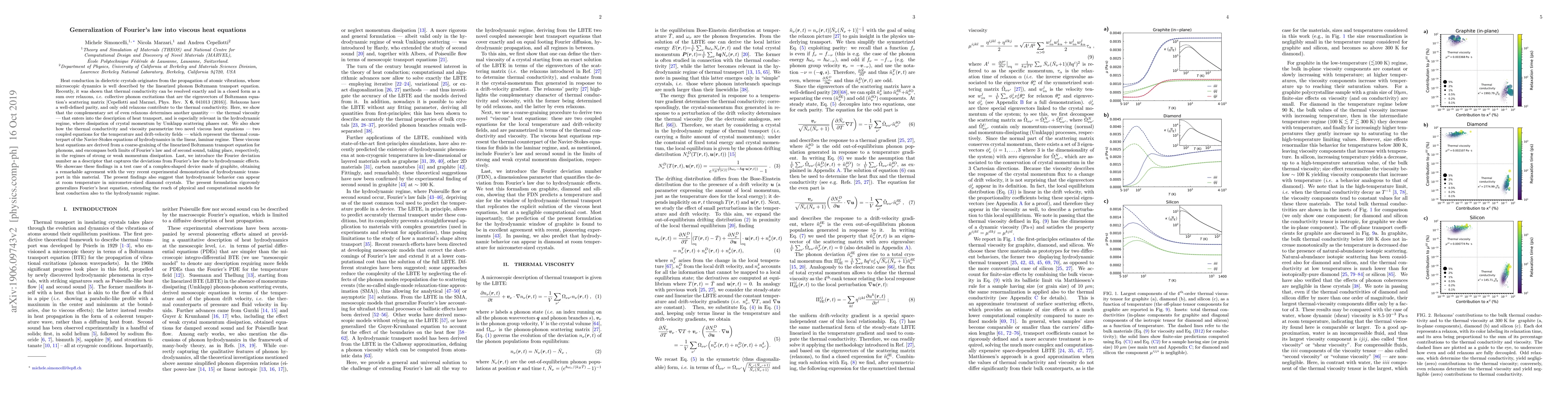 This paper generalizes Fourier's law into viscous heat equations by introducing thermal viscosity from even relaxons, which complements thermal conductivity from odd relaxons. The study derives two coupled viscous heat equations that describe heat transport in the hydrodynamic regime, showing remarkable agreement with experimental results in graphite and suggesting potential hydrodynamic behavior in diamond crystals at room temperature.