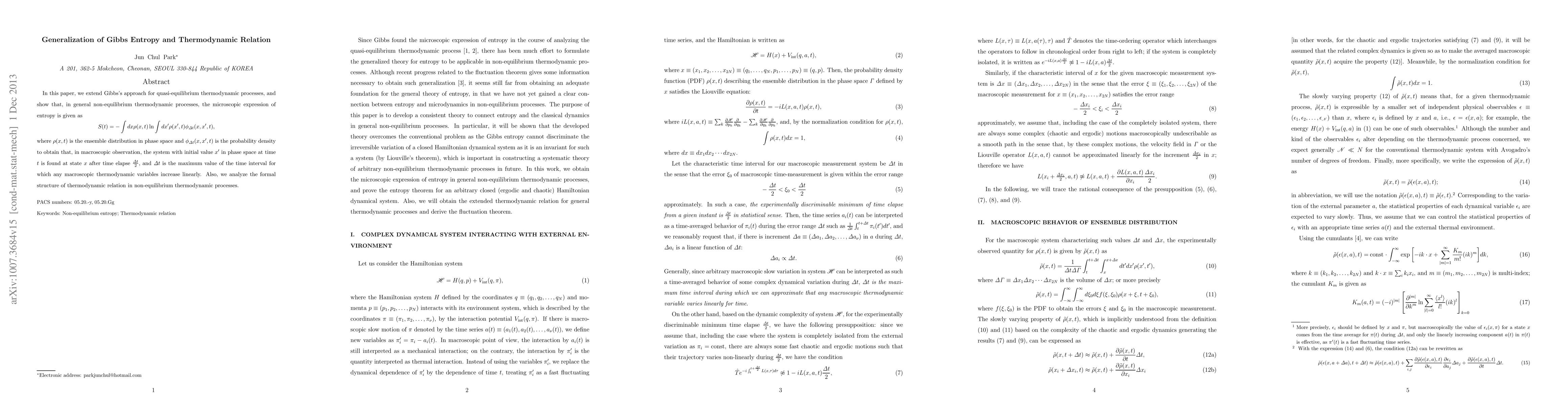 This paper extends Gibbs's quasi-equilibrium thermodynamic approach to derive a microscopic entropy expression for general non-equilibrium processes and examines the formal structure of thermodynamic relations in such contexts.