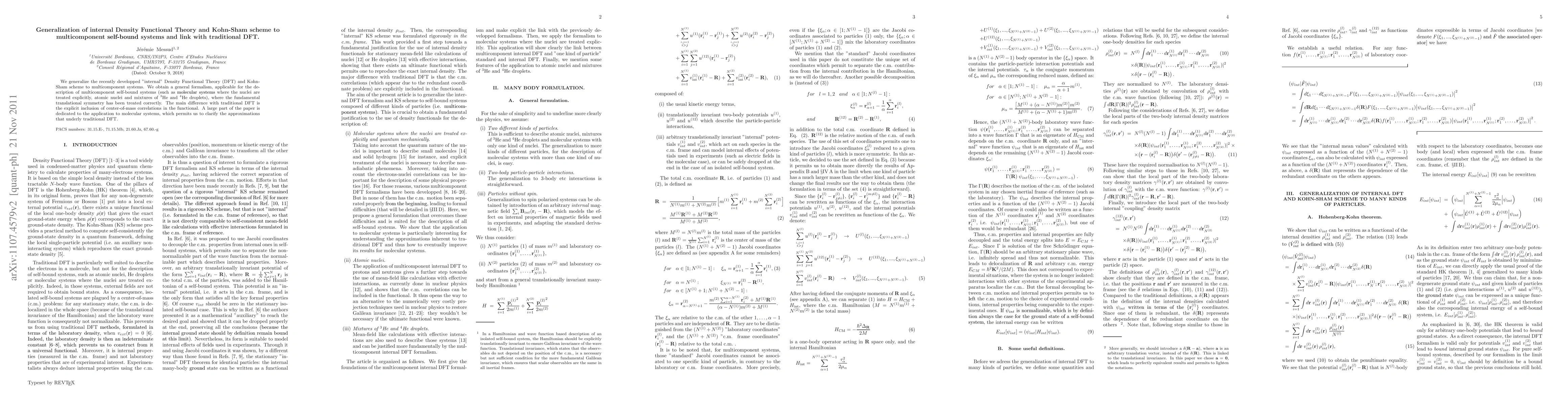 This paper generalizes the "internal" Density Functional Theory and Kohn-Sham scheme to multicomponent systems, introducing a formalism that explicitly includes center-of-mass correlations, applicable to self-bound systems like molecules and atomic nuclei. The work also clarifies the approximations in traditional DFT through its application to molecular systems.