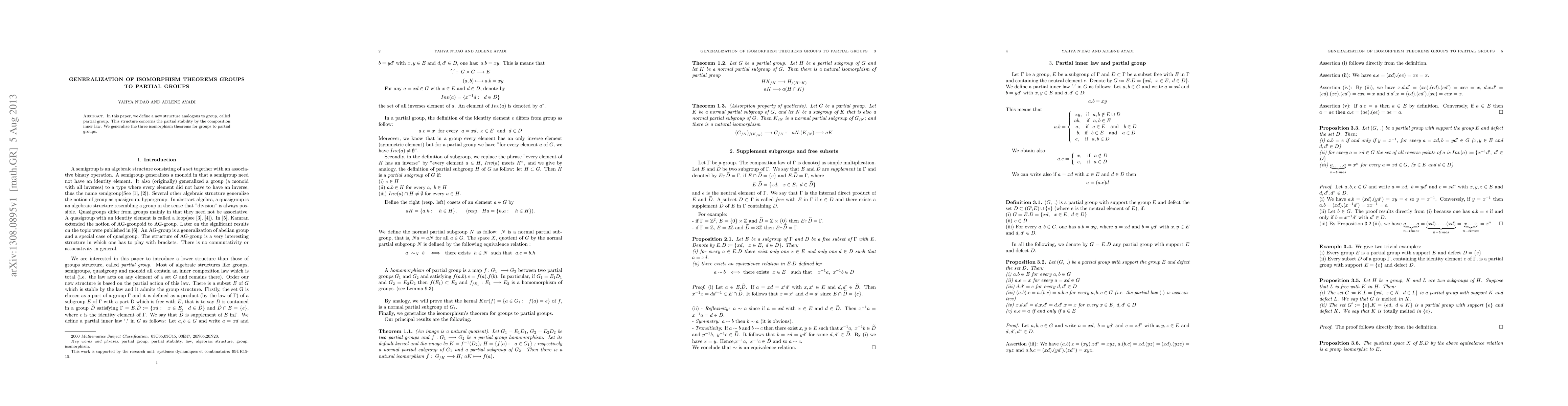In this paper, we define a new structure analogous to group, called partial group. This structure concerns the partial stability by the composition inner law. We generalize the three isomorphism theorems for groups to partial groups.