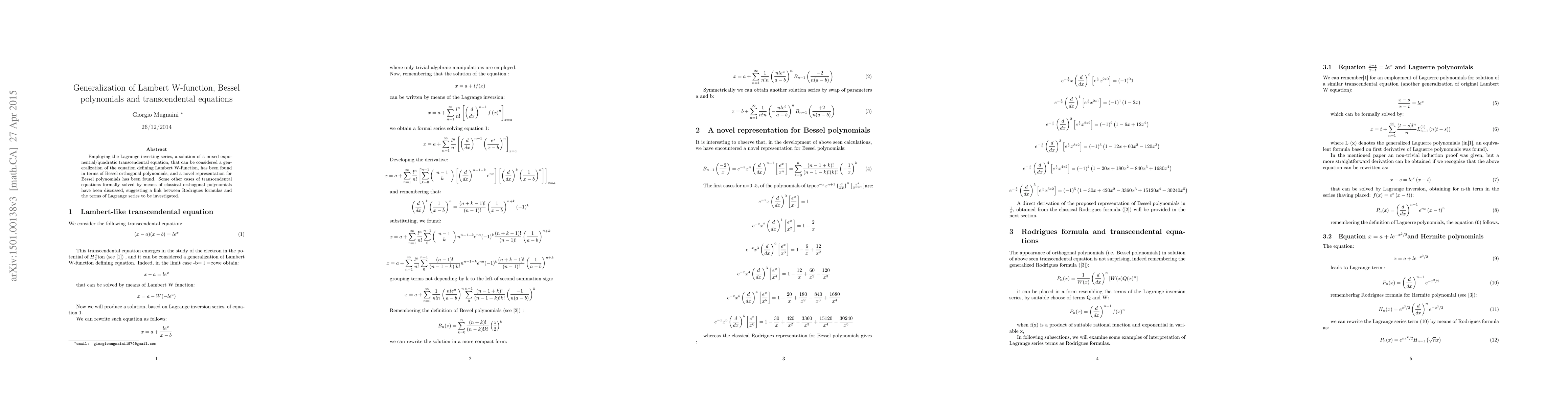 This paper generalizes the Lambert W function using the Lagrange inverting series to solve the transcendental equation $(x-a)(x-b)=le^{x}$ in terms of Bessel orthogonal polynomials. It reveals a novel representation for Bessel polynomials through a differential identity, suggesting a connection between Rodrigues formulas and Lagrange series.